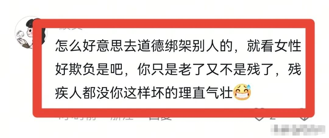 也有人认为,老年人既然选择乘坐地铁,说明身体状况还可以,因此应做好没有座位的心理准备。若上车后就欺负妇女和儿童,理直气壮地逼人让座,那便是道德绑架、倚老卖老的行为。