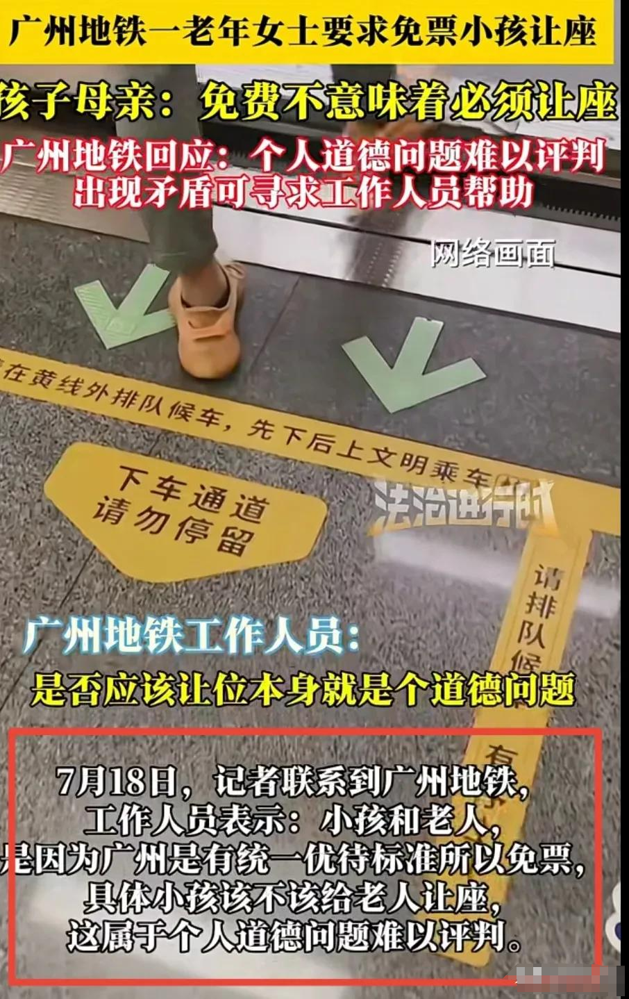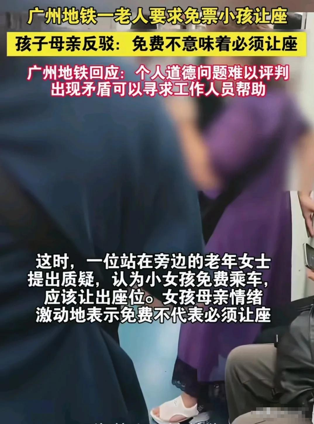 对此,广州地铁工作人员回应称:广州对老人和小孩实行免票优待政策,至于小孩是否该给老人让座,这属于个人道德范畴,他们也难以评判。