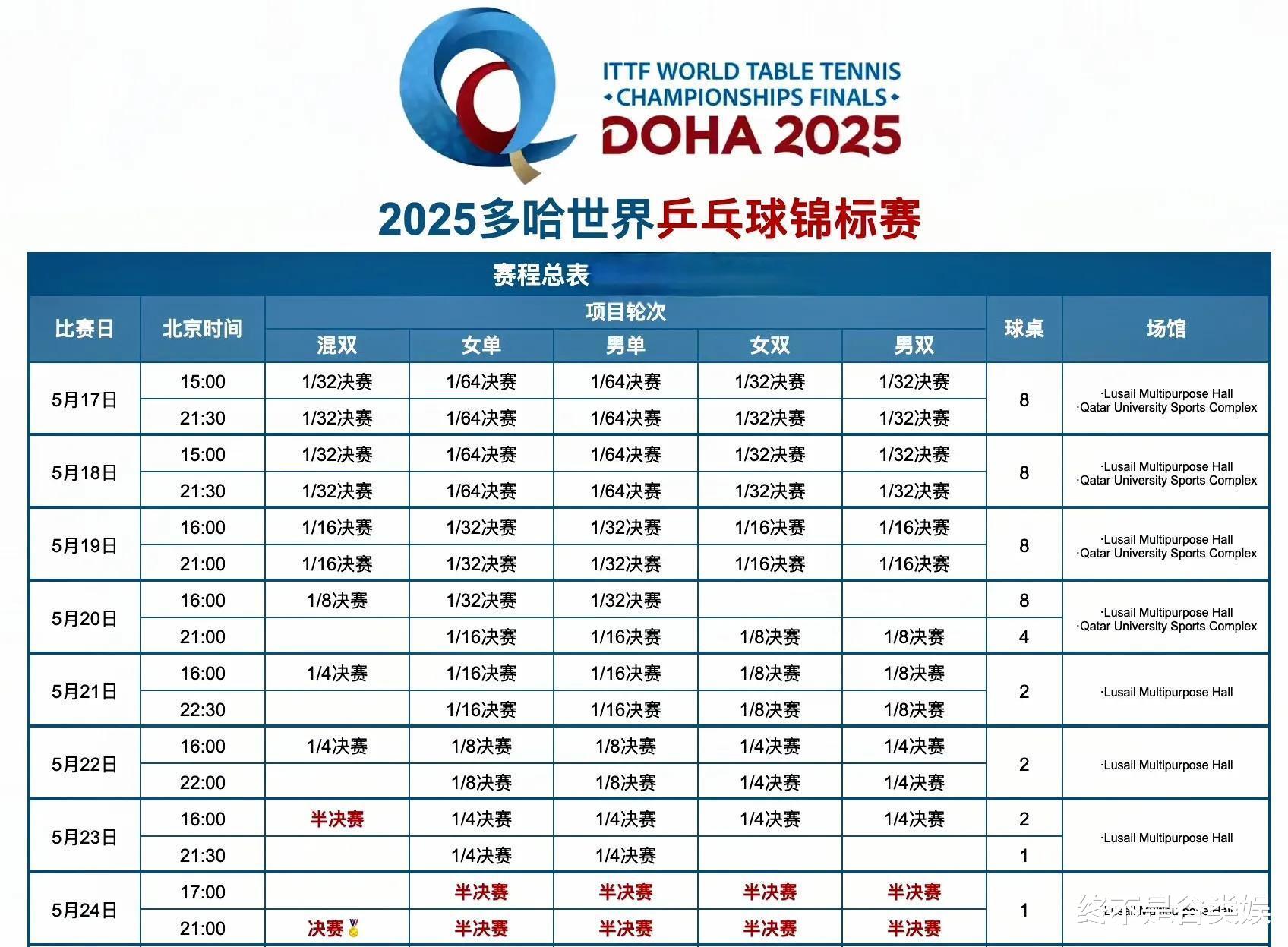 男队焦点集中在19岁的林诗栋身上。 他是本届国乒唯一兼三项的选手,而赛程表显示,多哈世乒赛9天比赛里有7天要同时开打五个项目。 这意味着林诗栋可能连续7天“一天打三场”,其中5月20日当天要先后对阵德国双打组合、韩国混双强敌以及男单32强赛。 日本队的张本美和、韩国队的申裕斌同样要扛三项,申裕斌此前在韩国队内测试中,曾因连续作战当场抽筋。