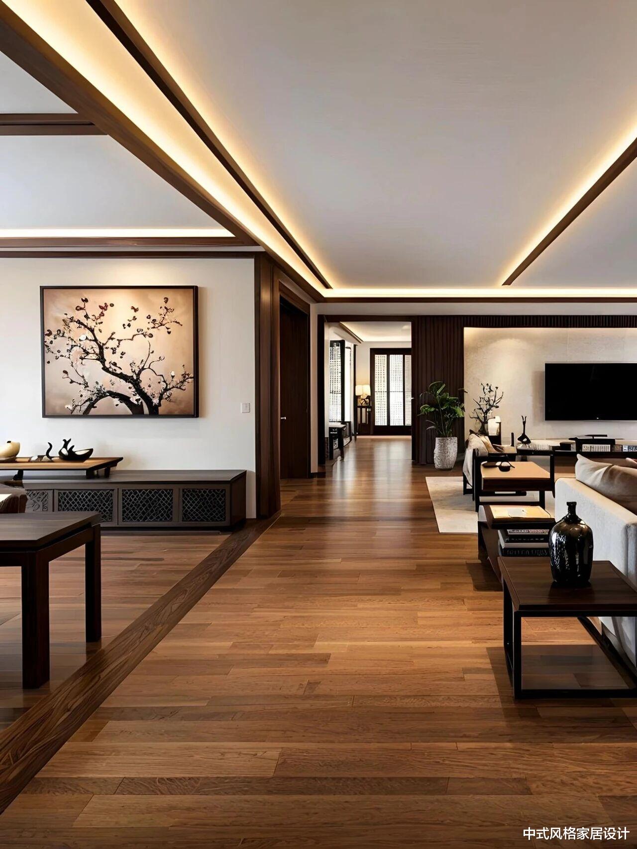 “宋式美学,美在简约而不简单,美在含蓄而非张扬。”设计师似乎深谙此道。整个公区采用开放式布局,让光线与空气自由流动,营造出开阔通透的视觉感受。胡桃木地板延伸开来,像是一卷缓缓展开的宣纸,上面书写着家的日常故事。