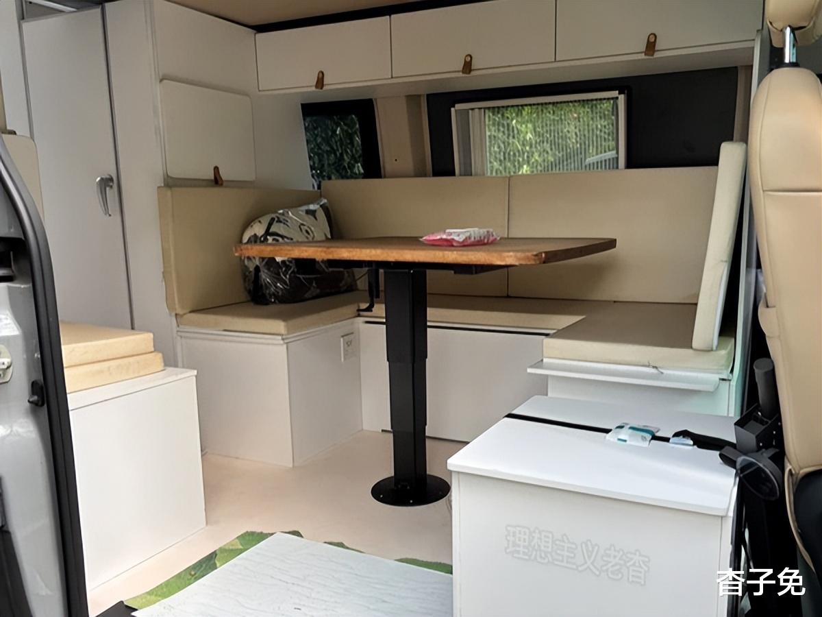 该车为4门5座,后排座椅变成了箱式U型沙发,中间添置了一张升降桌,组成车载小客厅,是日常喝茶吃饭与学习办公的地方。