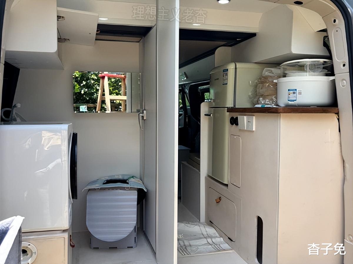 车尾也是别有乾坤,右侧是微厨区,有车载冰箱和电饭锅等厨房用品,带上食材就可在车内做饭;左侧是洗手间,可淋浴,可如厕,还可洗衣服,真可谓麻雀虽小五脏俱全。