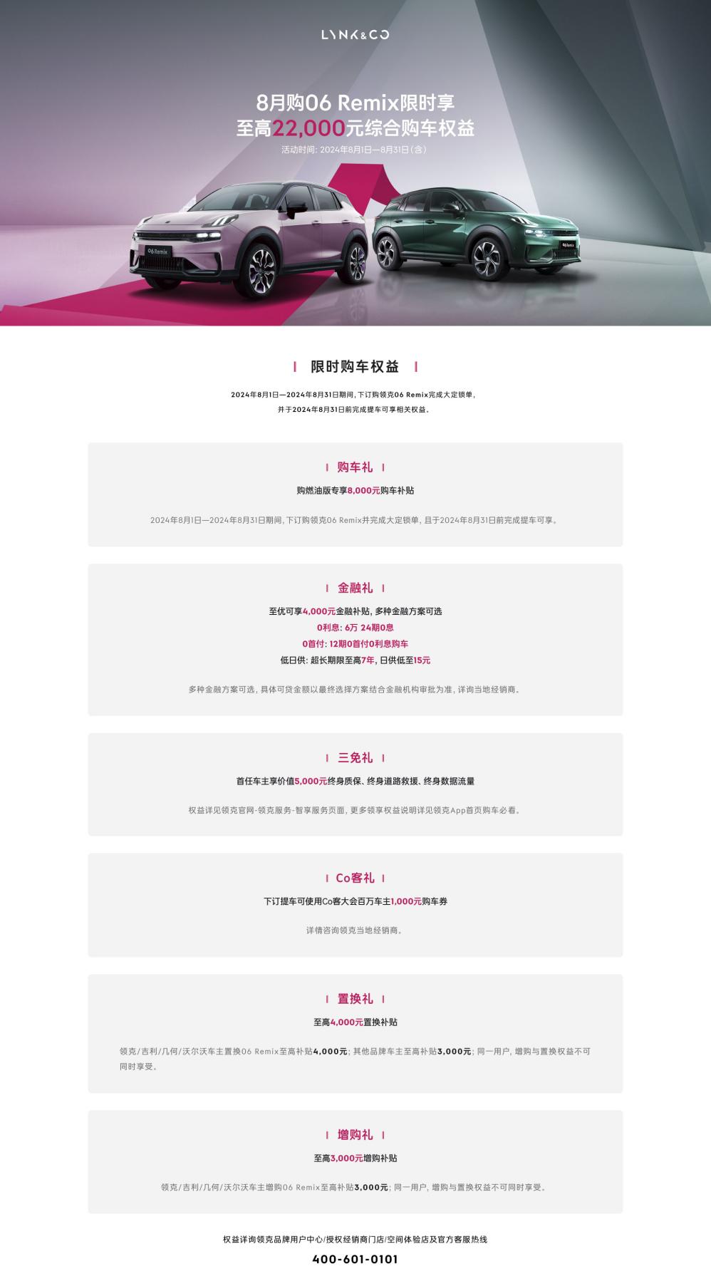领克06 Remix,作为领克燃油家族的明星车型,自上市以来便以青春时尚的设计风格和卓越的产品实力赢得了市场的广泛好评。进入8月后,官方还给出丰厚的权益,包括8000元的限时优惠、置换至高4000元补贴、增购至高3000元补贴,多种灵活的金融购车方案以及多重福利加持,入门款价格低至10.96万,让更多消费者都能享受到高品质出行体验。