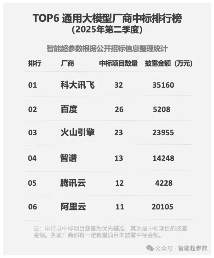 2025年,人工智能大模型市场风起云涌,各大科技巨头纷纷加大投入,在这片充满机遇与挑战的领域中激烈厮杀。而科大讯飞,凭借深厚的技术底蕴与敏锐的市场洞察力,在2025年上半年一路披荆斩棘,继2024年全年和2025年第一季度之后,第二季度再度蝉联中标项目数量、金额双第一,成为当之无愧的大模型中标赛场“王者之师”。