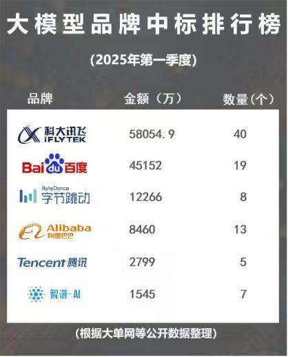 回溯2025年第一季度,科大讯飞便已展现出强大的市场统治力。大单网等公开数据清晰显示,国内各大模型品牌中标竞争中,科大讯飞以超过5.8亿元的中标金额,将其他竞争对手远远甩在身后。旗下讯飞智元信息科技有限公司表现惊艳,虽项目数量仅10个,却斩获29066.29万元中标金额,占据科大讯飞整体金额的半壁江山,其专注于高价值项目的战略布局成效显著。讯飞医疗科技也不甘示弱收获应用型订单,这无疑是科大讯飞大模型1+N战略在市场层面的生动实践。