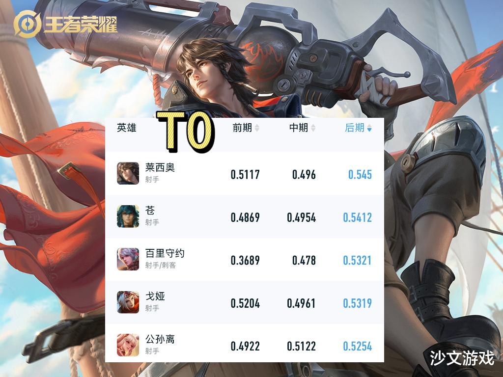 排在发育路后期强势度T0的英雄有莱西奥、苍、百里守约、戈娅、公孙离,这些英雄的后期强势指数在0.52%至0.55%之间。这些英雄都是机动性很强,后期相对较难单切掉的射手。