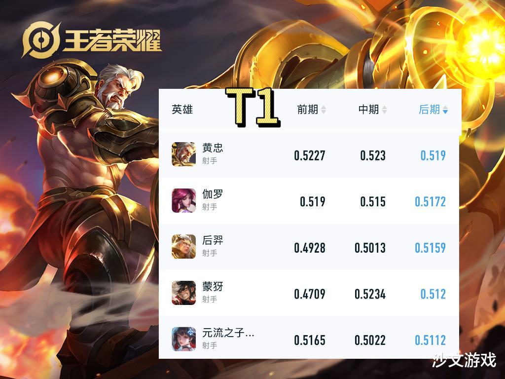 发育路后期强势度T1的英雄有黄忠、伽罗、后羿、蒙犽、元流之子(射手),这些英雄的后期强势指数在0.51%至0.52%之间。这些英雄机动性差一些,后期输出能力强,但是很怕对面战士英雄突脸。