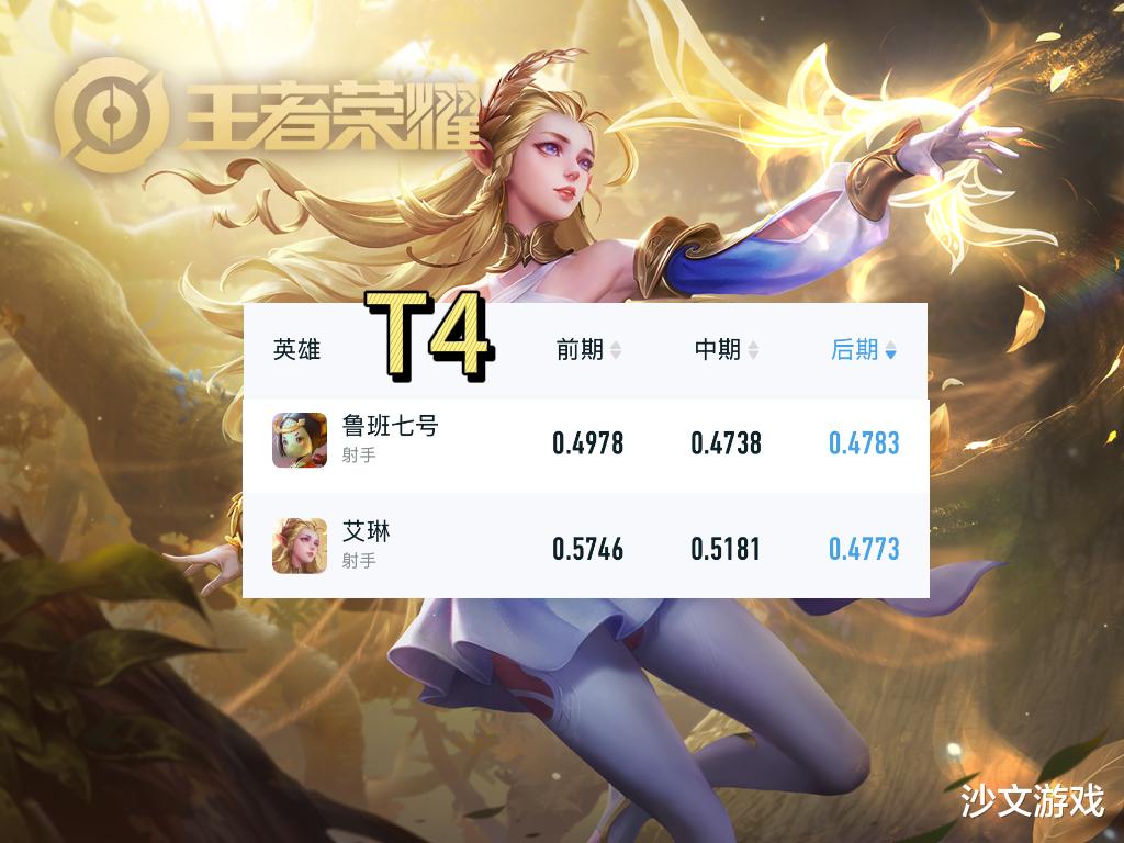 发育路后期强势度T0的英雄有鲁班七号、艾琳,这些英雄的后期强势指数在0.47%至0.48%之间。