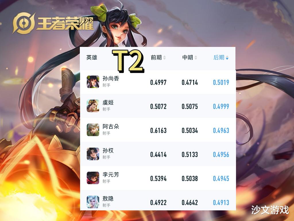 发育路后期强势度T2的英雄有孙尚香、虞姬、阿古朵、孙权、李元芳、敖隐,这些英雄的后期强势指数在0.49%至0.50%之间。