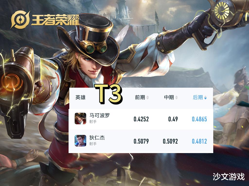 发育路后期强势度T3的英雄有马可波罗、狄仁杰,这些英雄的后期强势指数在0.48%至0.49%之间。