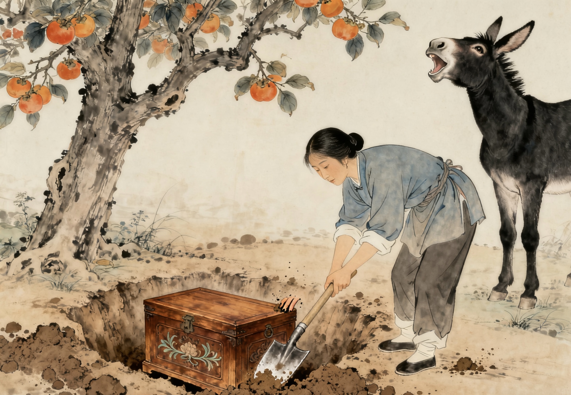 走了大约半个时辰,驴在一棵老柿树下停了下来。这棵老柿树有上百年了,树干粗壮,枝繁叶茂,桂兰小时候还在这儿摘过柿子。驴用蹄子在树下刨了刨,接着抬头看着桂兰,又长嘶了一声。