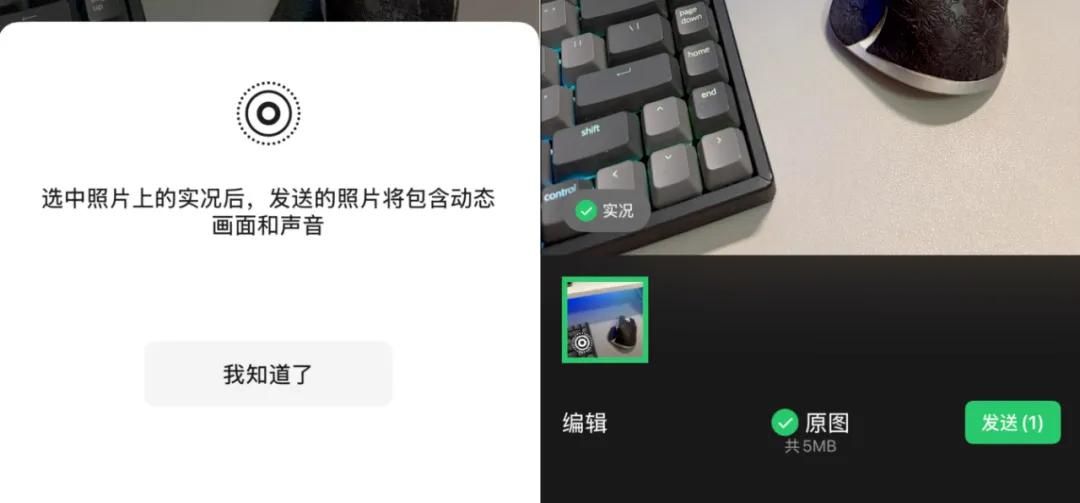 实况图片:支持的场景包括聊天框、朋友圈以及微信状态。只需打开聊天框-照片,即可选中并发送实况照片,照片包含动态画面和声音。通过实况图形式发送的照片,接收方的机型支持该功能,才可以查看动态画面以及声音信息。