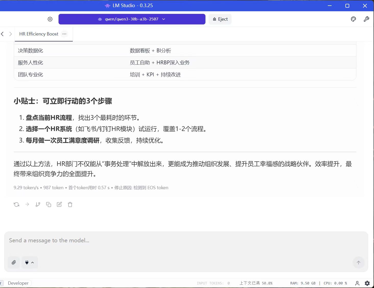 使用qwen-30b本地大模型,测试硬件的运算能力。可以看到随着模型体积的增大,处理的速度有些下降,在10 tokens/s左右,不过依旧是可以正常使用的速度,不会出现一个字一个字蹦的现象,不影响正常阅读。