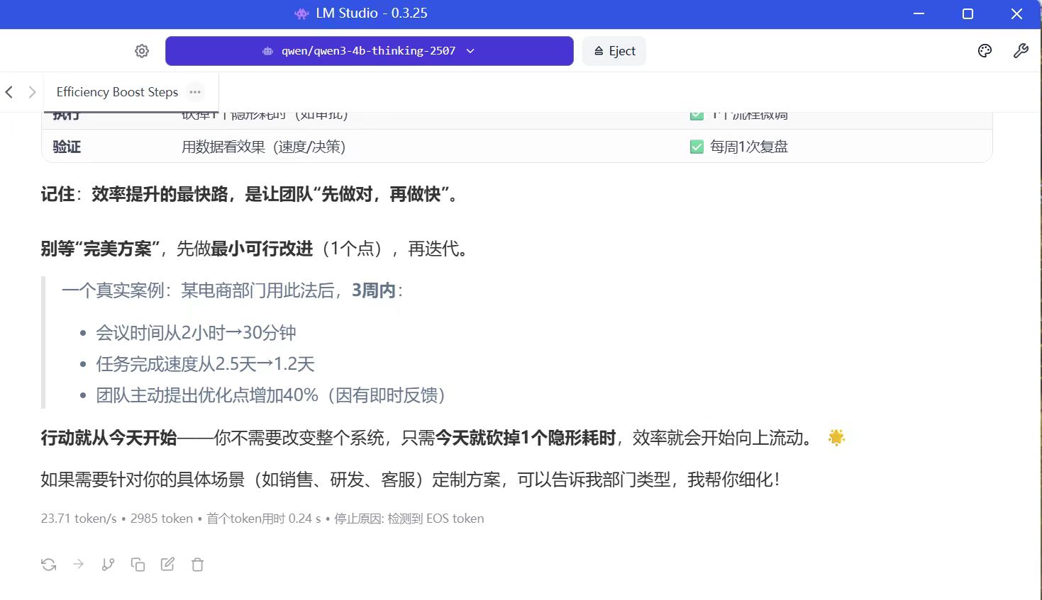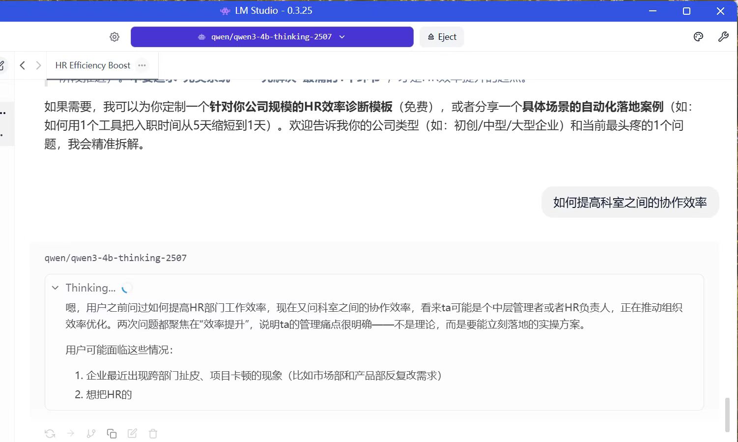 使用qwen-4b本地大模型,针对工作中“部门内部如何提高各科室之间的协作效率”的问题,输入关键词提问。