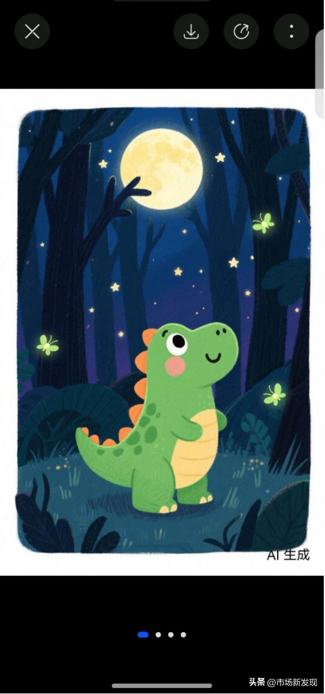 十几秒后,几张色彩鲜明、线条圆润的插画就生成了,完全是我想象中的绘本风格!小恐龙的表情活灵活现,月亮也透着温馨,孩子看着这些图,听我现场编的故事,听得津津有味,还不停地指着图追问细节,互动感特别强。果真“用小艺,事事都容易”!
