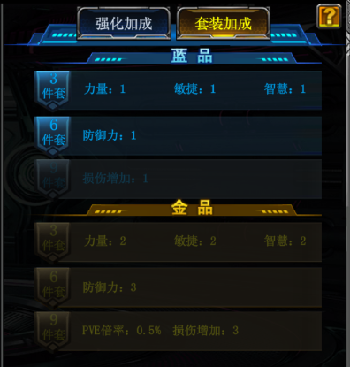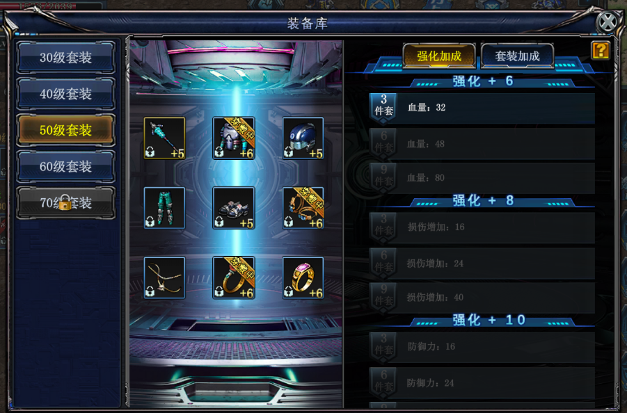 装备库的强化加成分为三个阶段:+6、+8以及+10。每个阶段属性加成各有不同。前期金色装备较难获取,选取蓝色装备即可。其强化加成达到+6即可,避免过于浪费材料资源,之后再慢慢换成金色装备。
