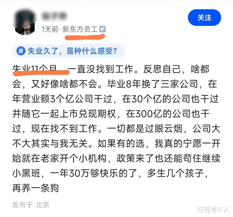 新东方前员工的窘境:失业11个月,一直没找到工作。这名前员工如此描述目前的现状:反思自己,啥都会,又好像啥都不会,毕业8年换了三家公司,在年营业额3个亿公司干过,在30个亿的公司也干过并随它一起上市兑现期权,在300亿的公司也干过,现在找不到工作。