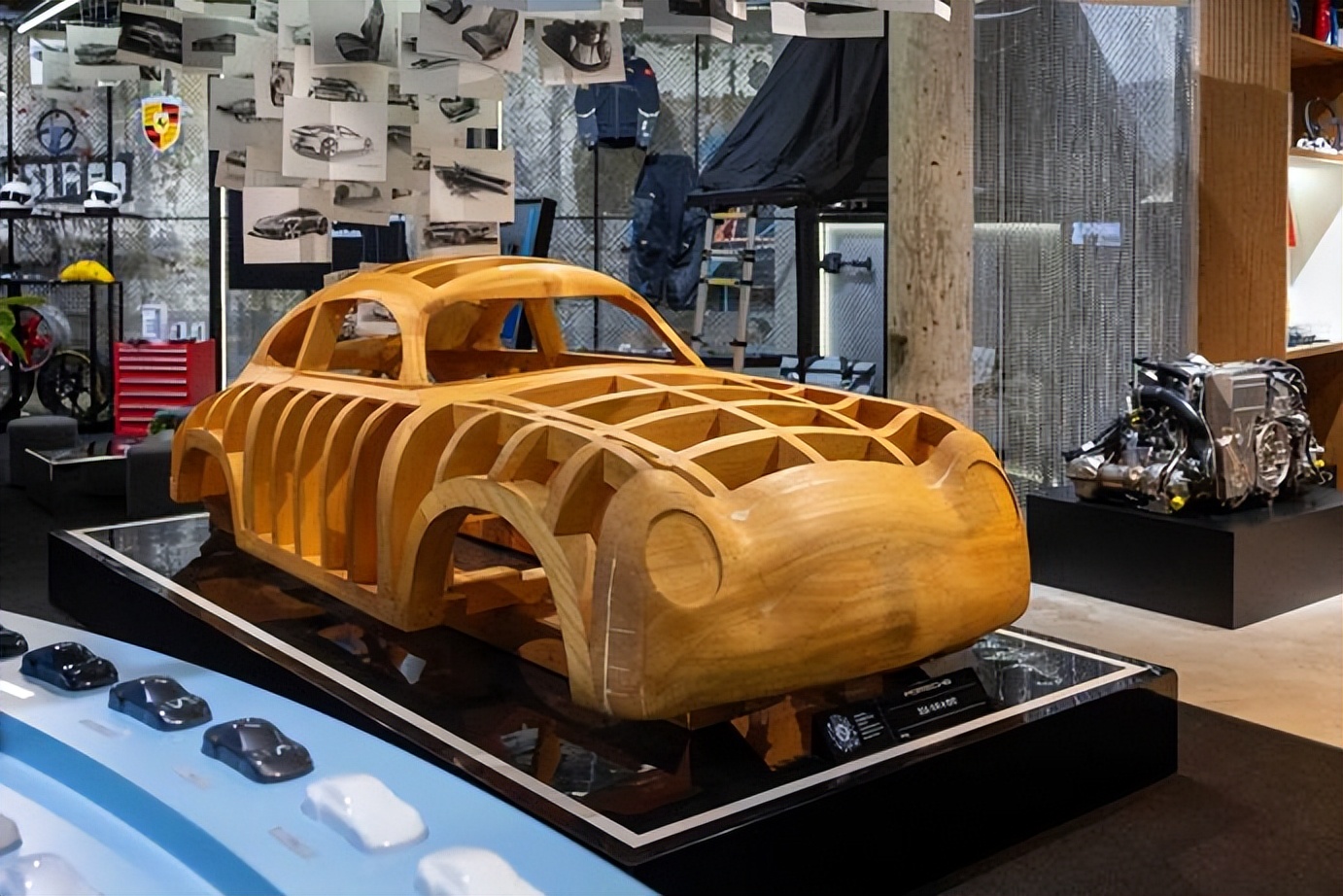 356白蜡木模型:展示1948年用于打造首辆356的车身框架,见证保时捷设计与工艺的起源;