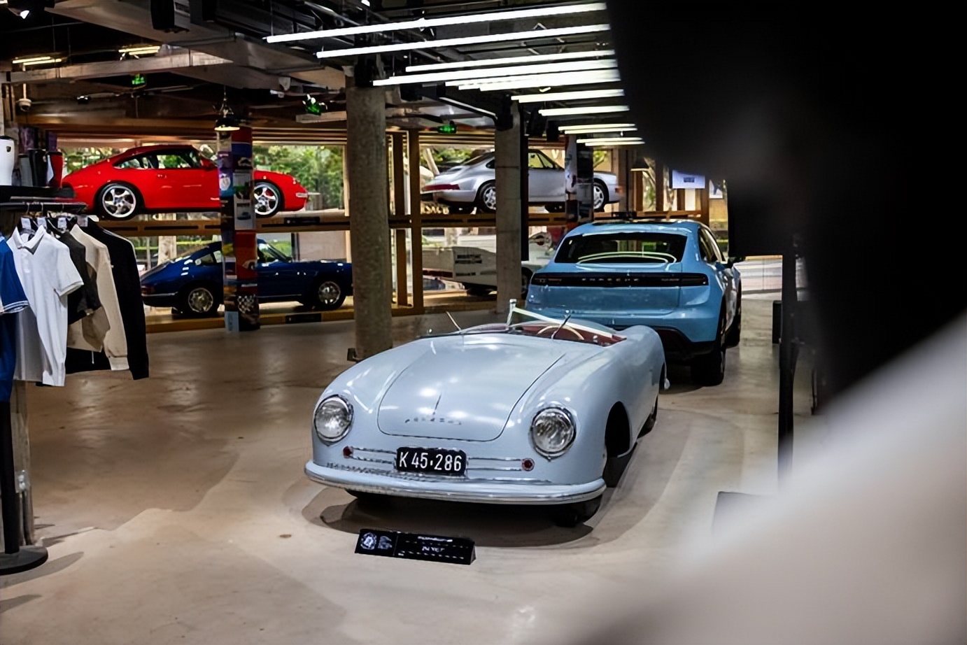传奇工厂:陈列鼻祖车型356 No.1 Roadster与纯电动Macan,寓意品牌从传奇起源到电动未来的传承;