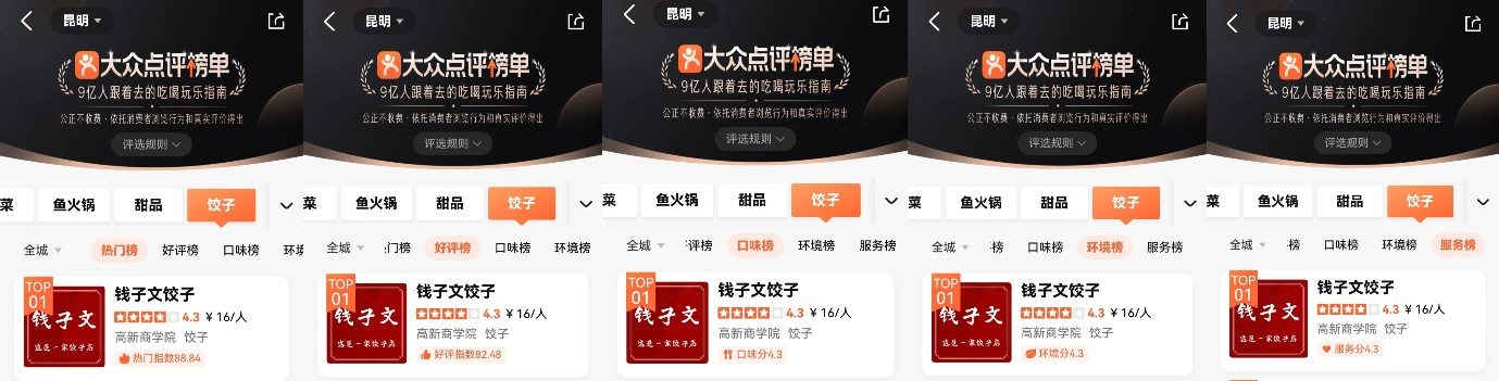 近日,位于昆明五华区岭东商业广场一层的钱子文饺子店,在开业仅一个月的时间里,强势包揽大众点评昆明饺子榜“热门榜”、“好评榜”、“口味榜”、“环境榜”“服务榜”五榜第一,成为春城餐饮界的“新晋顶流”,用匠心与诚意赢得了消费者的广泛认可。