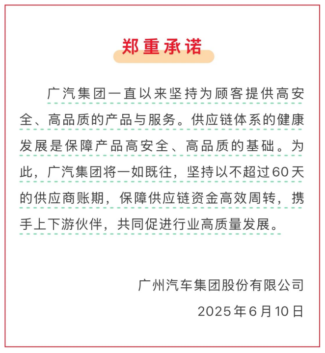 广汽集团率先发布关于供应商账期的郑重承诺