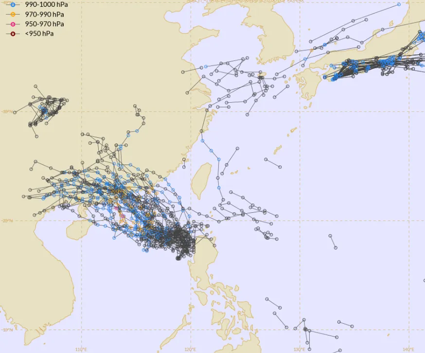 所以,巅峰气压值就是999hPa,如果形成了16号台风塔巴,那也就是一个小台风的趋势,相当于8级左右的热带风暴,要么就是低压发展,没有更强。