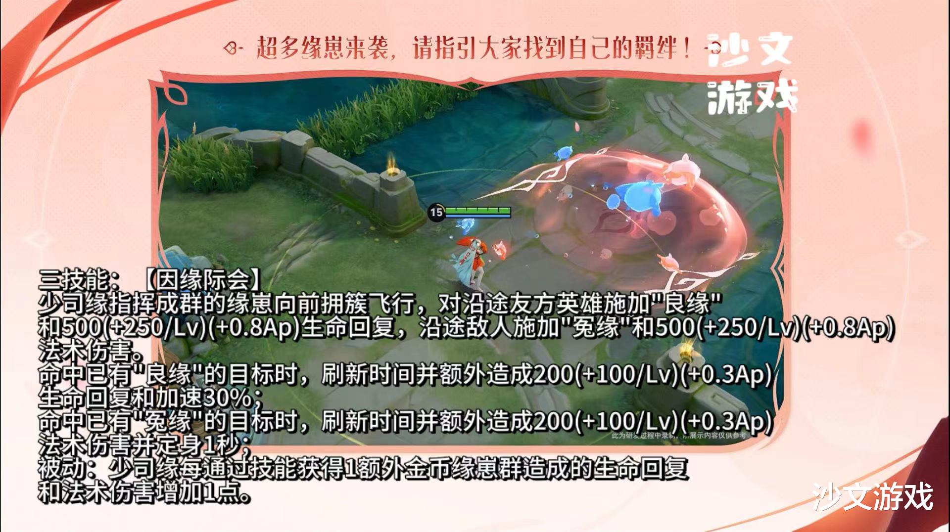 最后是大招【因缘际会】,这个技能是少司缘的核心团战技能。她可以指挥成群的缘崽向前飞行,对沿途的友方英雄施加“良缘”并回复生命值,对敌人则施加“冤缘”并造成法术伤害。这个技能的存在,让少司缘在团战中有了极高的战略价值,她可以通过这个技能快速地为队友提供生命回复,同时又能对敌方英雄造成大量伤害。
