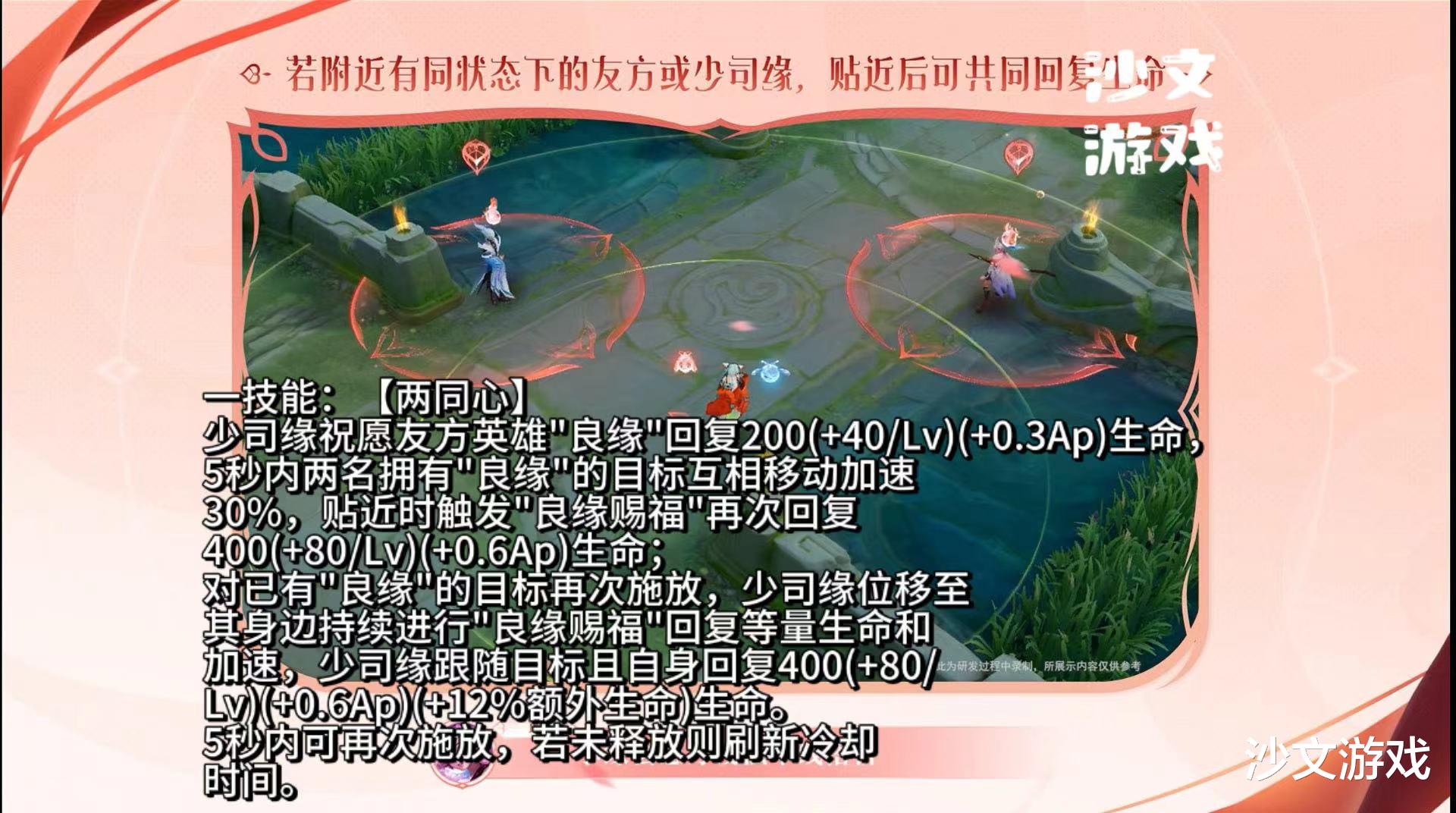 接下来是一技能【两同心】,这个技能展现了少司缘作为团队支援者的能力。她可以为友方英雄施加“良缘”,回复其生命值,并在两名拥有“良缘”的目标靠近时触发“良缘赐福”,再次回复生命值并增加移动速度。这个技能的存在,让少司缘在团队中扮演了重要的支援角色,她可以通过这个技能快速地为队友提供生命回复,或是帮助队友逃脱敌人的追击。