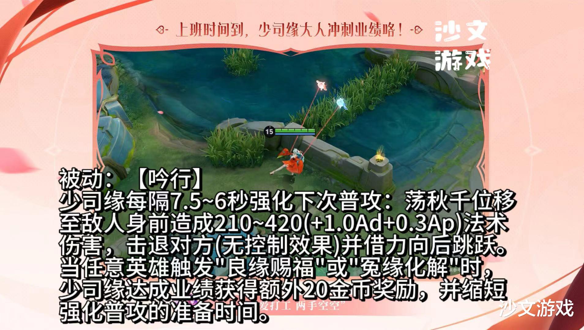 首先是被动技能【吟行】,这个技能让少司缘在每隔一段时间后,下一次普攻能造成额外的法术伤害并击退敌人。这个设计让少司缘在对抗时有了更多的选择,她可以利用这个技能进行位移,或是利用击退效果打断敌人的技能释放。同时,当友方或敌方英雄触发“良缘赐福”或“冤缘化解”时,少司缘还能获得额外的金币奖励,并缩短强化普攻的准备时间,这让她在战斗中的持续作战能力大大增强。