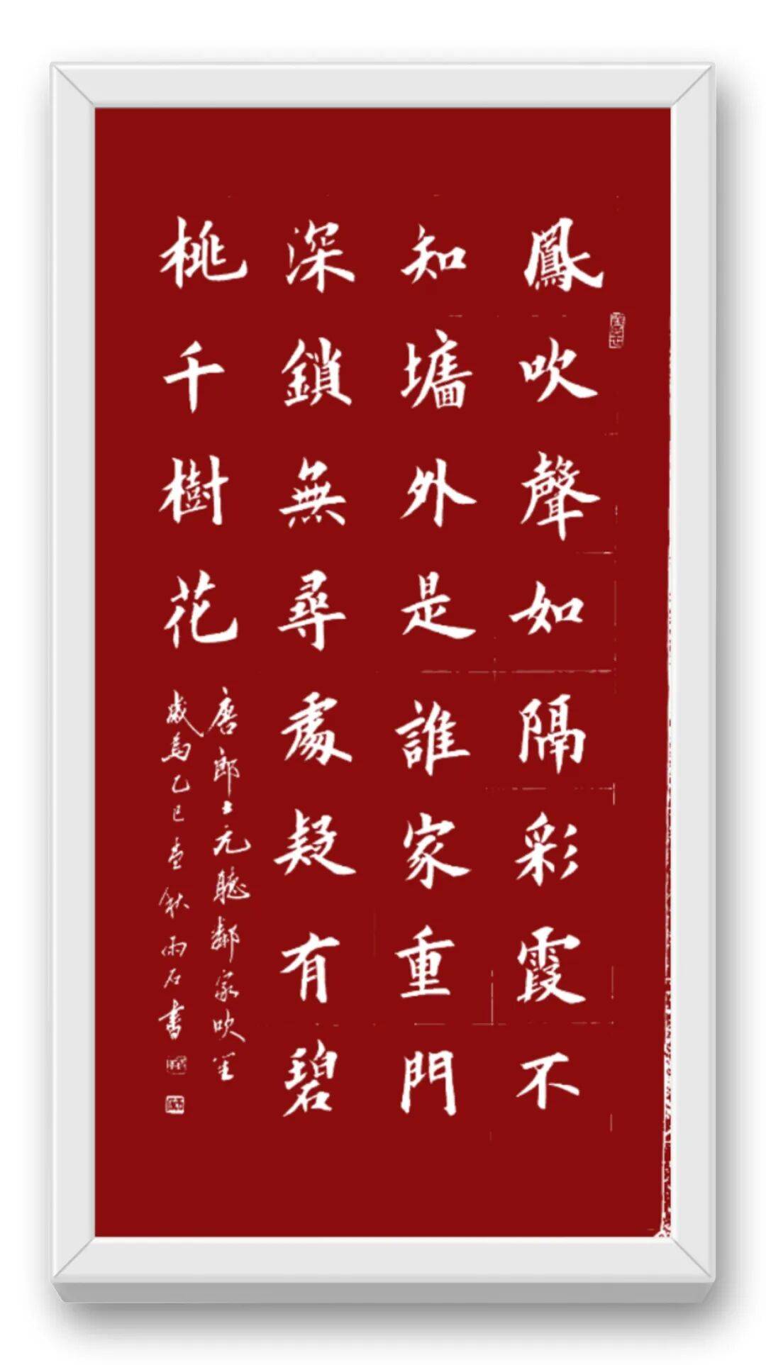 雨石楷书,以欧阳询为本,厚重秀美,自成风貌。蝇头小楷功力超群,代表作《蝇头小楷金刚经10米长卷》。