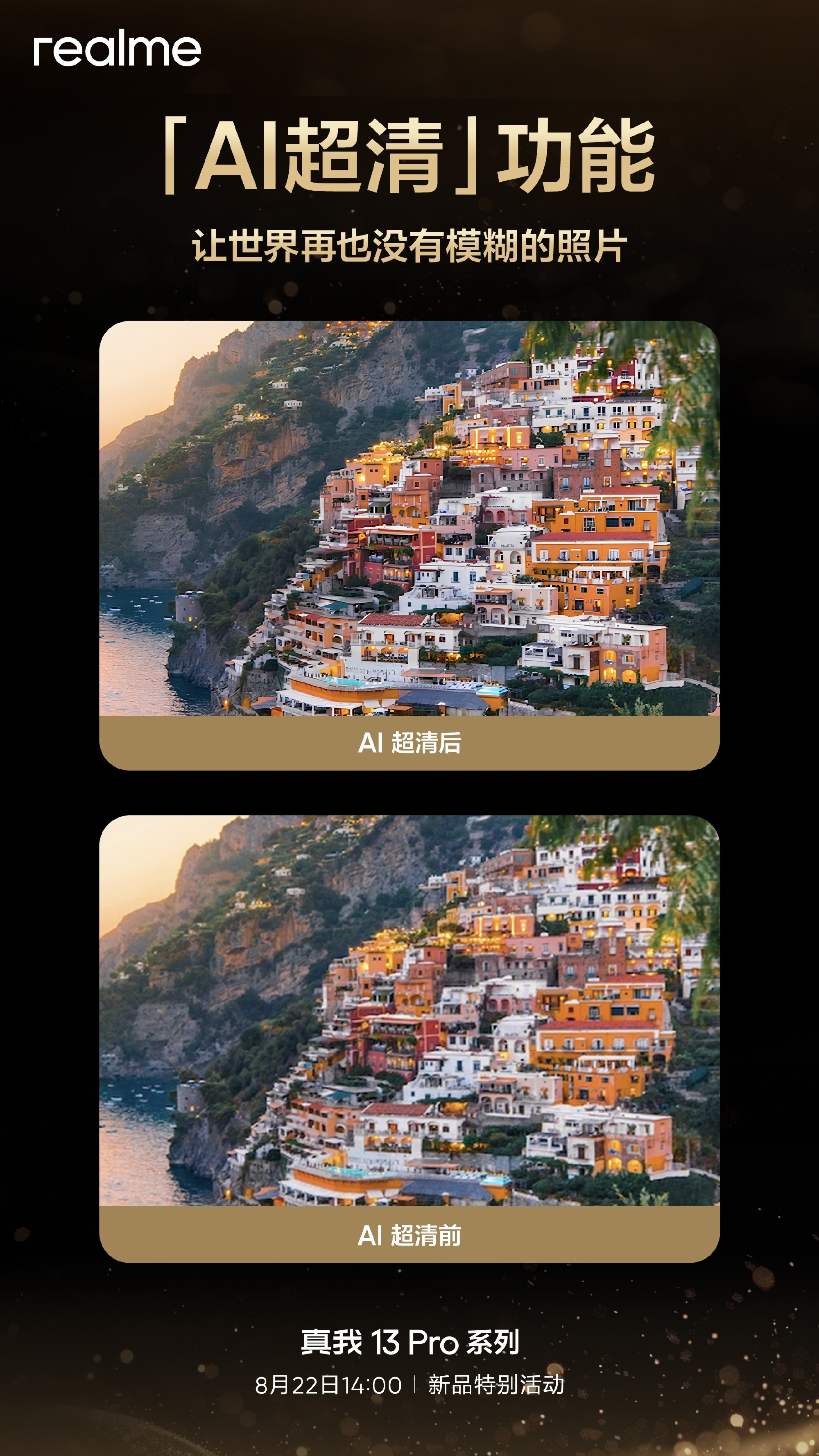 看来AI真的是未来手机要开始内卷的新赛道了,不仅是华米OV等国产品牌,就连迟迟不上AI的iPhone手机也将会安排上AI,可以看出AI确实是接下来的风口。现在手机内置的AI功能就包括修图常用到的AI消除,AI闭眼修复等。甚至后面还将带来更多的AI功能,就拿将于8月22日发布的真我13 Pro系列来说,它就带来了「AI超清」功能,可以一键让废片变超清大片,实用性非常高!