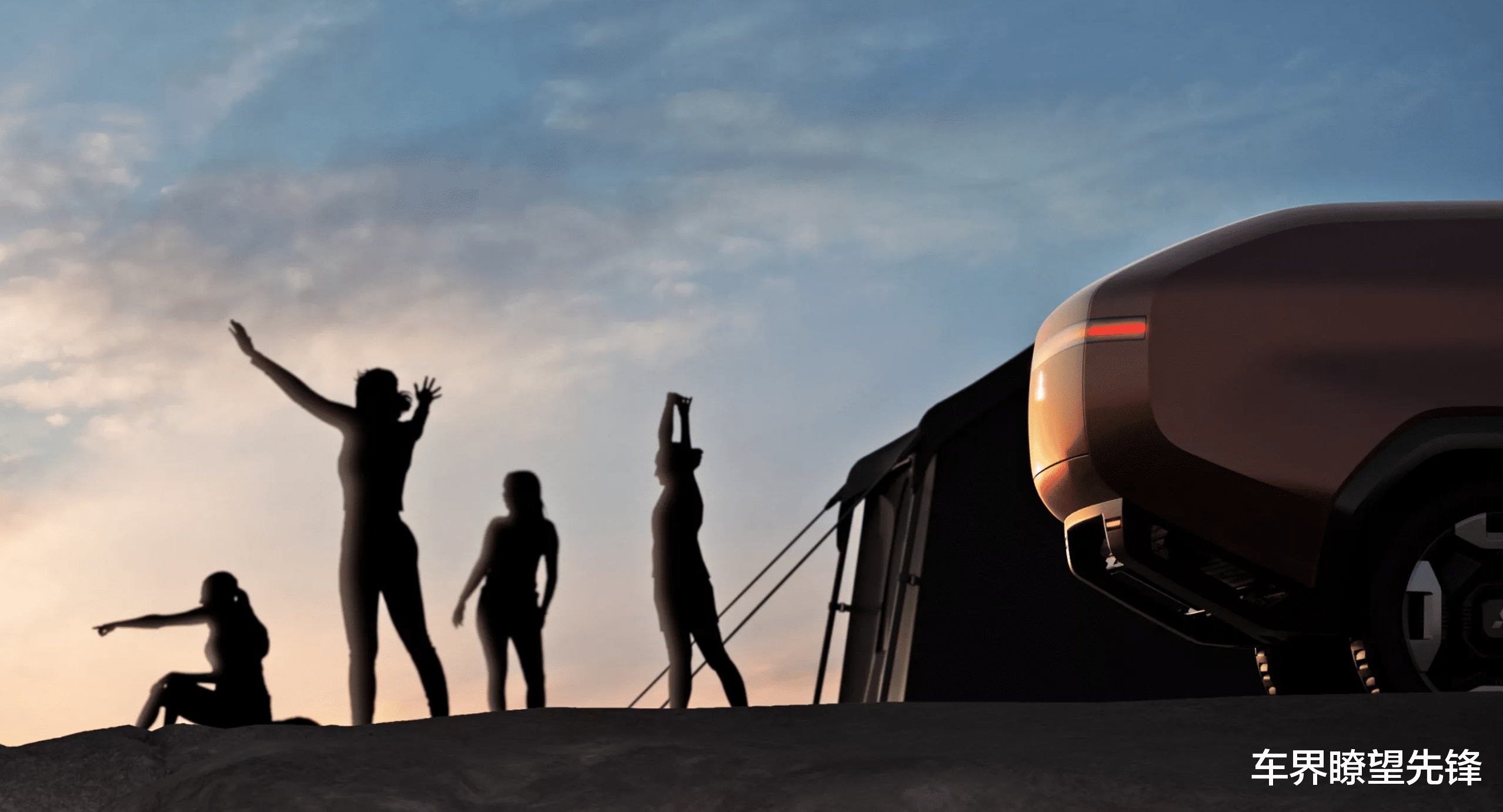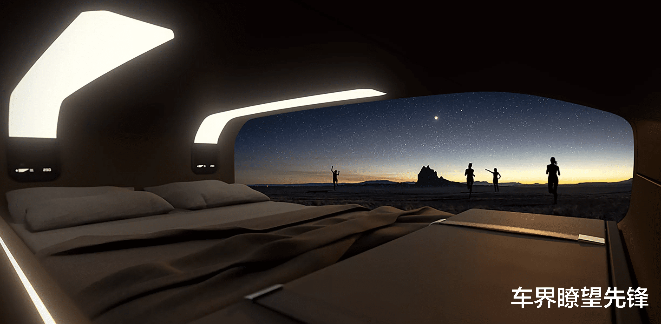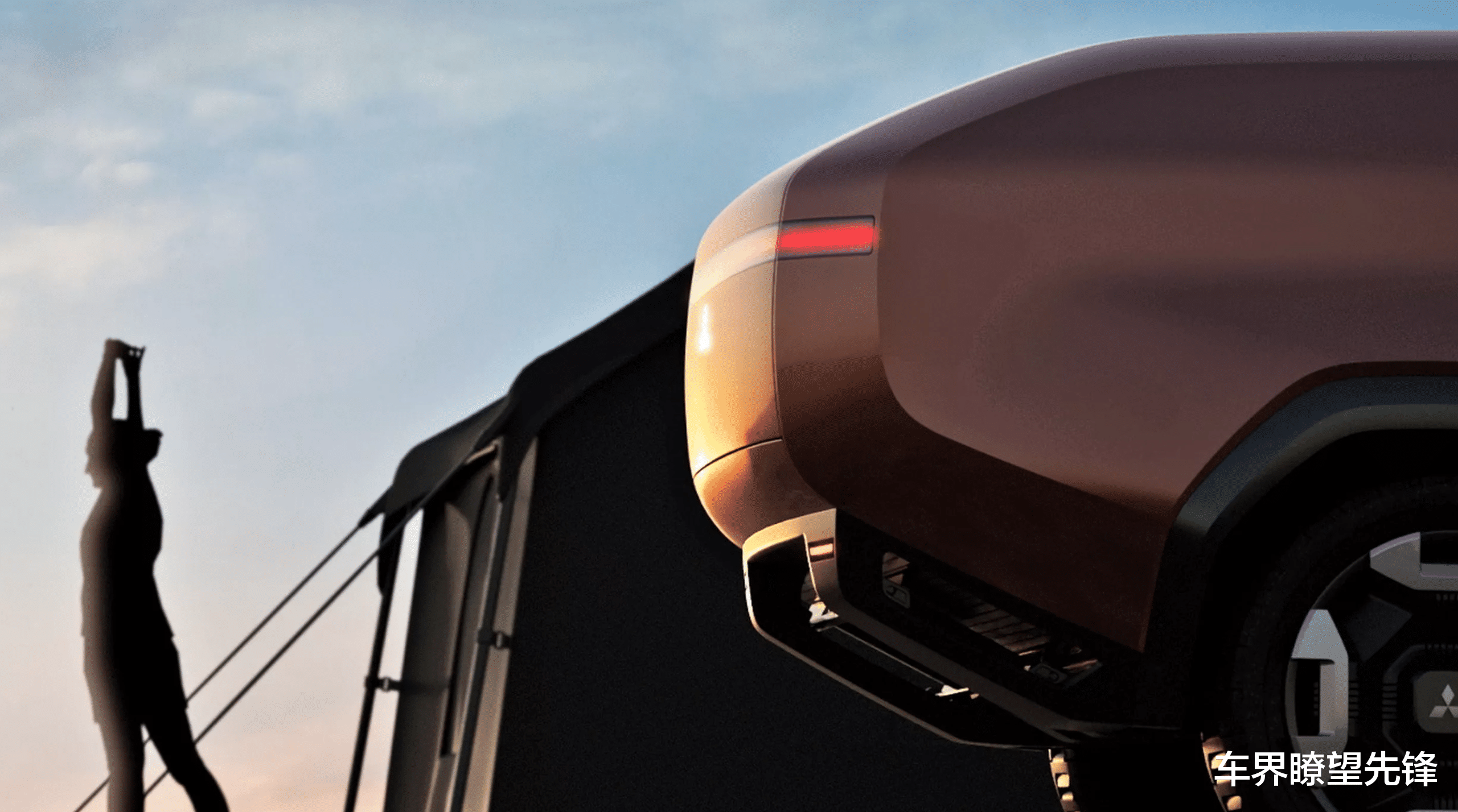 轮胎和挡泥板看上去都比较扎实,预计就是主打越野。从图片中还可以看出,车厢后半部分形成了一张双人床,而且是横向的,说明该车的车宽应该比较充足,并且周边还提供了氛围灯。虽然暂时无法看到全车身的样貌,但从目前的图片可以看出,整车的尺寸应该比三菱在2023年推出的概念车D:X更大一些。