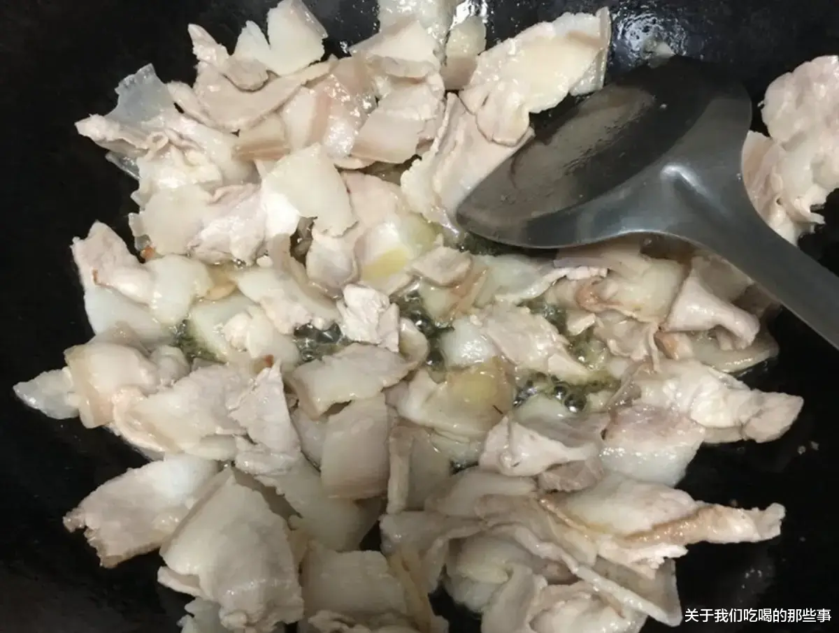 第四步,锅内加少许猪油,烧热后放入肉片,不断翻炒,炒到肉片打卷,且出油脂。(不要炒出太多油脂,不然肉片太干,影响口感。用的五花肉不打卷,就看出油情况)