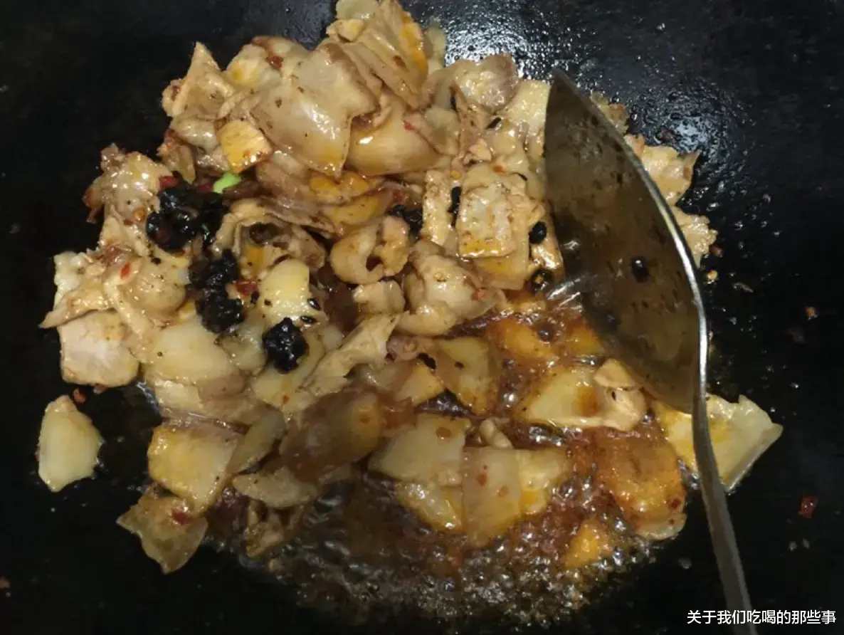 第六步,接着放入豆瓣酱、豆豉翻炒,炒出香味,再放入少许甜面酱、酱油翻炒。