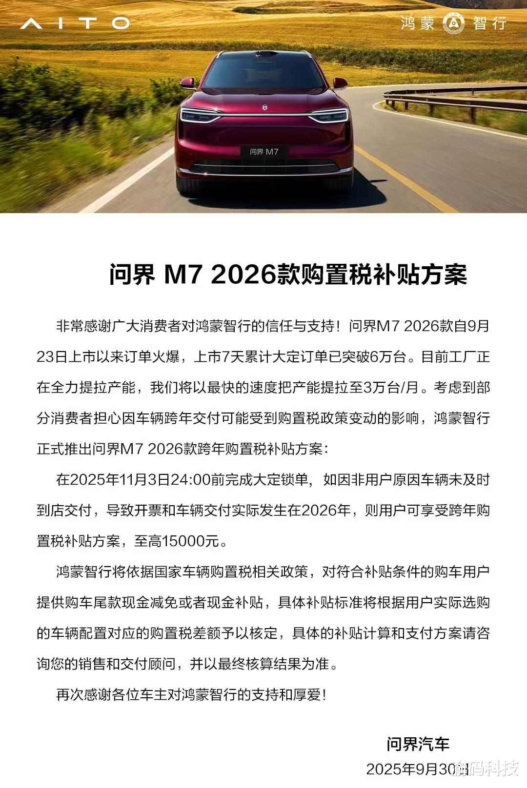 9月30日,问界汽车正式发布问界M7 2026款跨年购置税补贴方案,明确在2025年11月3日24:00前完成大定锁单的用户,若因非自身原因导致车辆交付开票时间延至2026年,仍可享受至高15000元的购置税补贴。