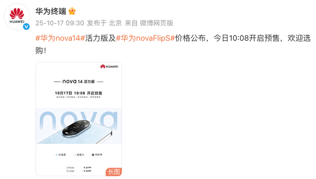 10月17日10:08,华为nova 14 活力版正式在华为商城及各大授权电商平台开启预售,并将于10月24日全面开售,起售价为2199元,作为面相年轻人打造的5G手机,它以“前后5000万像素超清影像系统”为核心优势,自拍清晰、夜拍通透、聚会拍摄不糊片,轻松定格生活中的高光时刻。如果你预算在2000元档,又不愿在拍照体验上妥协,那么华为nova 14 活力版是一款果断入手的机型。