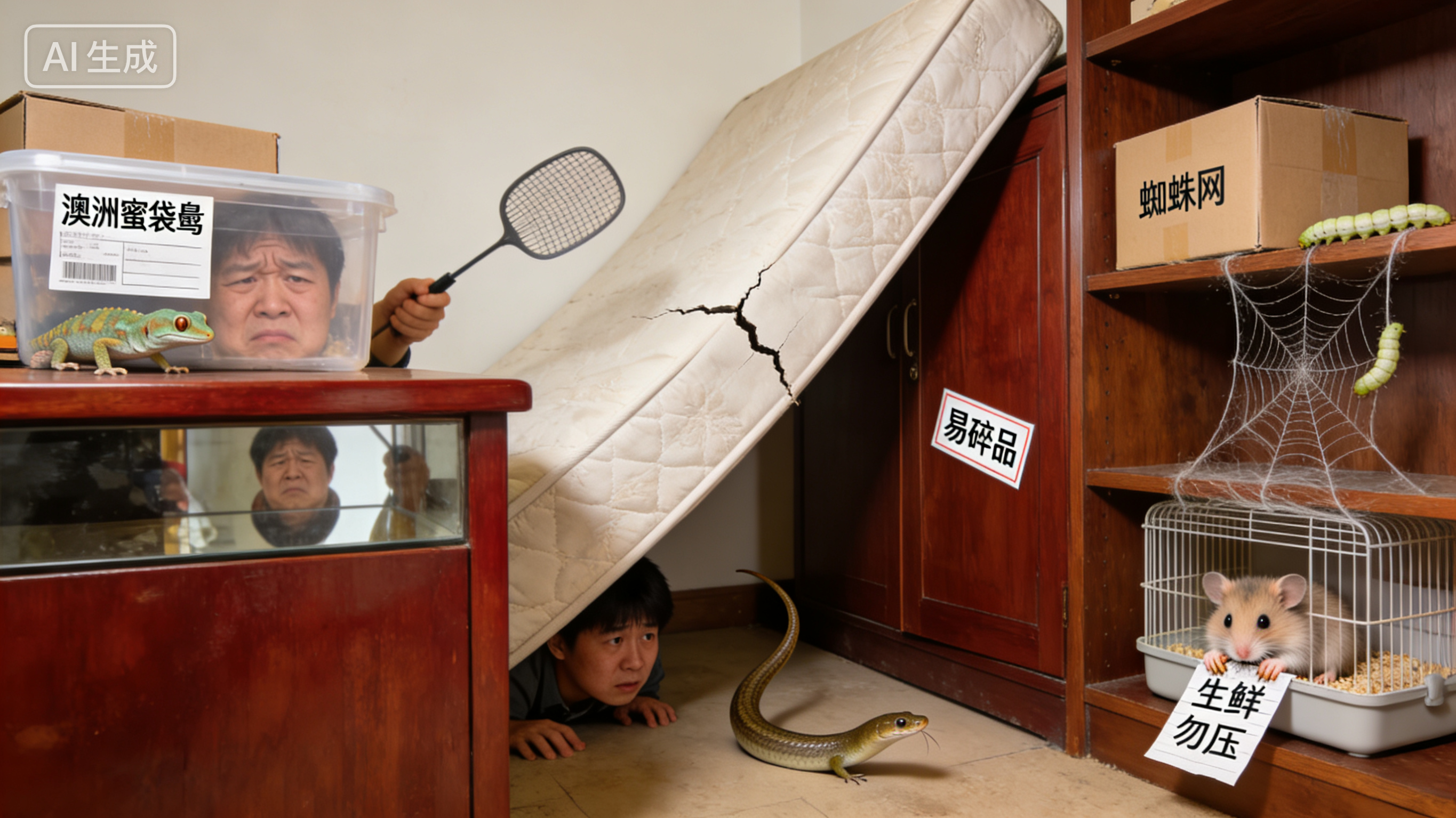 我为啥知道得这么清楚?因为这些人取快递的时候,根本不等回家,直接就在驿站门口把包装拆了!泥鳅从袋子里蹦出来,在地上乱跳,弄得满地是水;蚕宝宝吐的丝粘在驿站的红木货架上,黑乎乎的一团;变色龙被放在小盒子里,睁着眼睛盯着你,看得人浑身发毛!