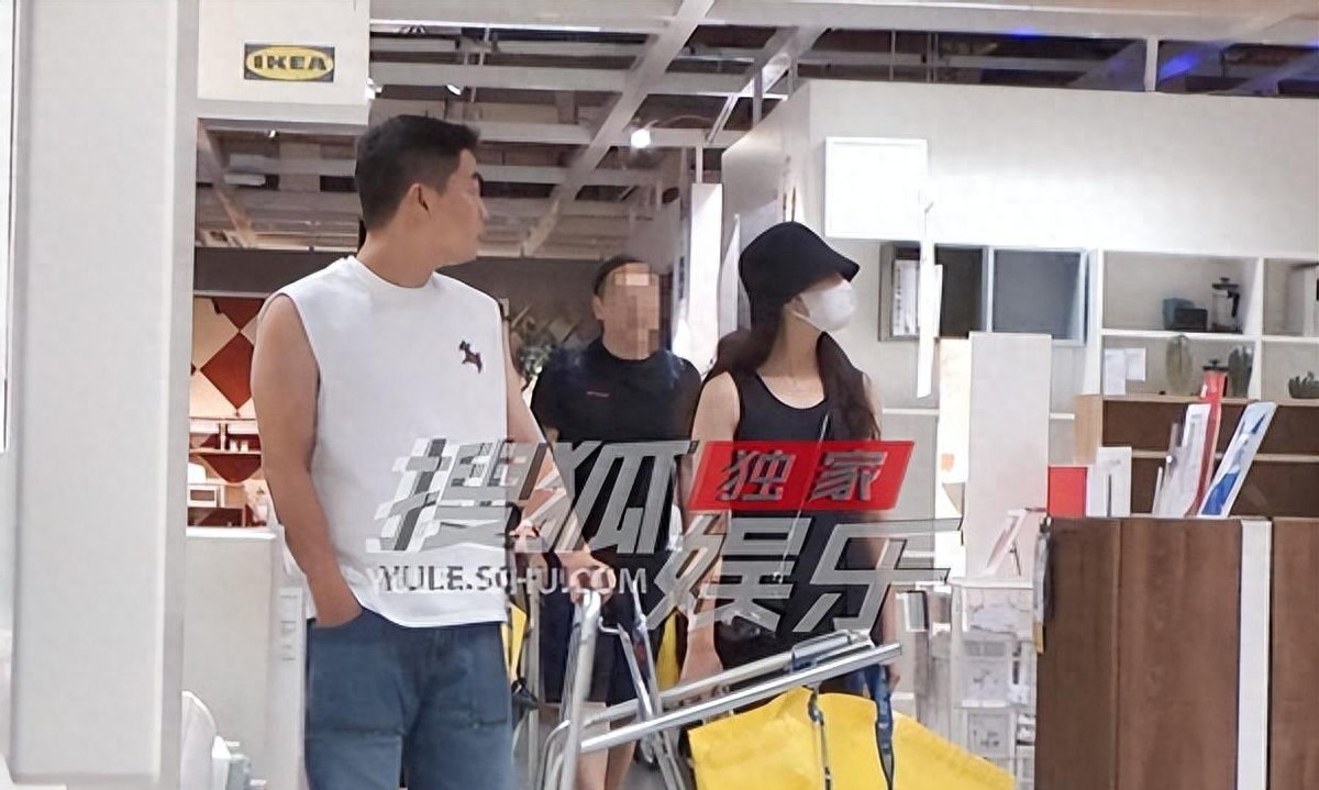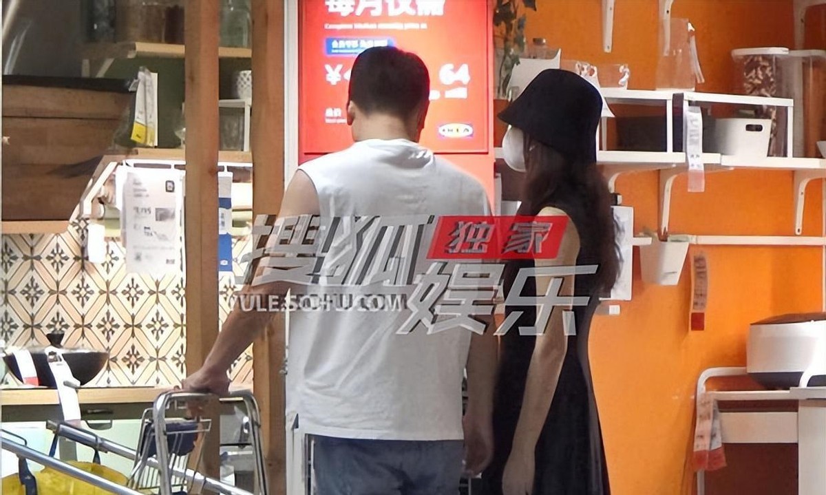 照片里,殷桃一身黑色连衣裙,头戴渔夫帽和口罩,打扮低调,和一身材健硕的男子在家具城里边走边看,似乎在为爱巢添置家具。