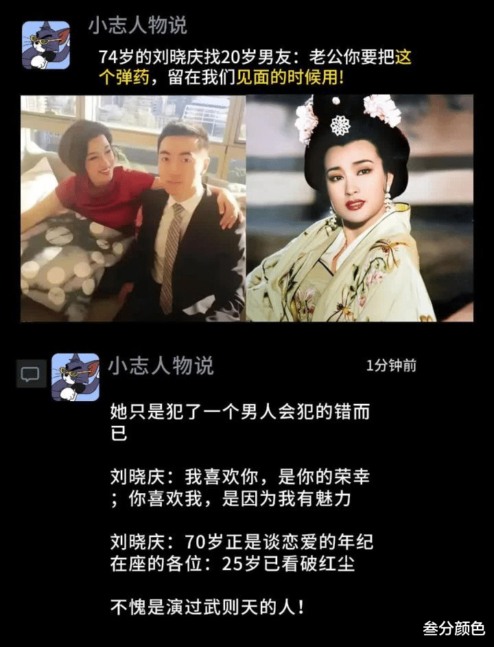 关注刘晓庆的网友越来越多,也就不可避免的发现,72岁的庆奶依然还在深受“感情困扰”。