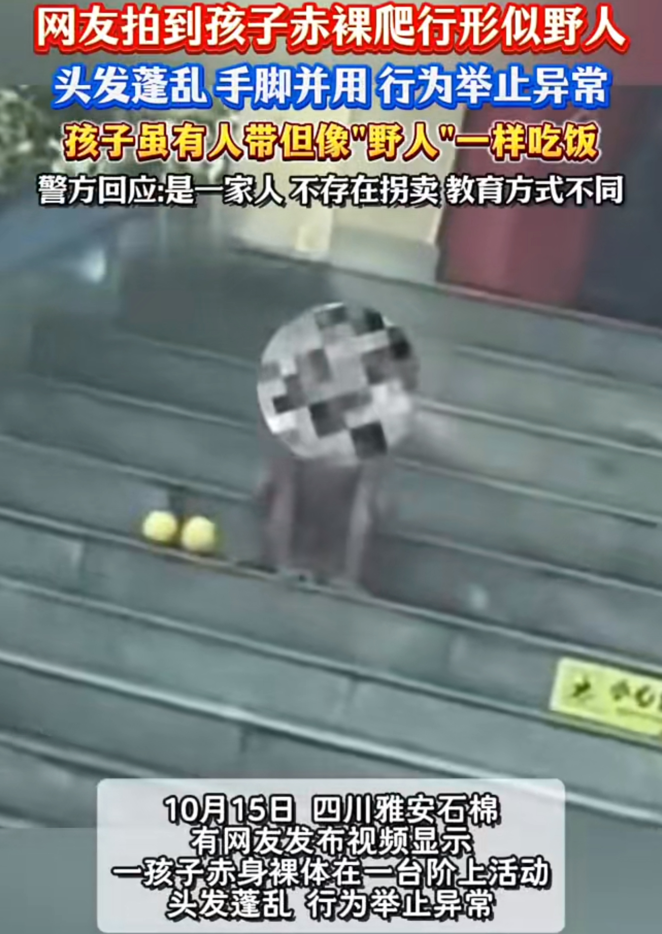 这两天四川雅安石棉县的一则视频在社交平台炸开了锅——有网友拍到个三岁左右的孩子,赤身裸体在台阶上爬,头发乱得像鸡窝,吃饭时直接趴地上用手抓,动作活像只小野兽。拍摄者急得当场报警,结果警察到场一查,人家是一家人,孩子爹妈就在旁边,还理直气壮说:“我们就是这么教育的。”