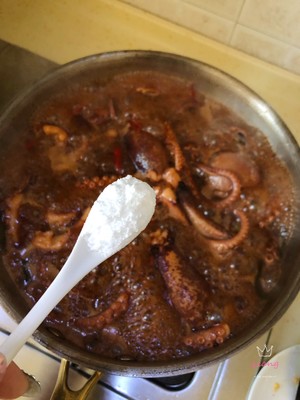 加入生抽、耗油、少许糖,加水没过八爪鱼,盖盖焖煮 不用加盐~~