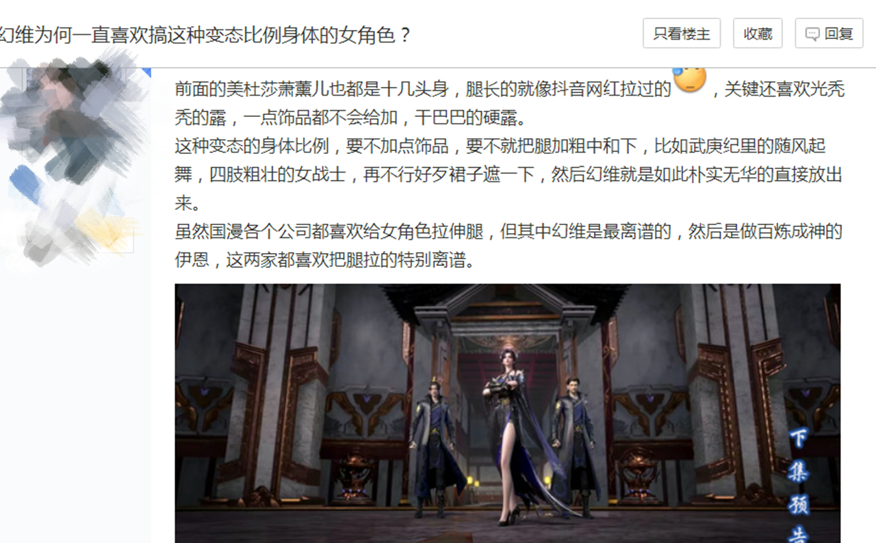 从这次《斗破苍穹》年番被骂卖肉的事情来看,不少网友觉得《斗破苍穹》动漫官方在做美女角色的时候问题很大,尤其是这些美女的身材比例过于夸张,而且一双大长腿简直离谱。无论是小医仙还是萧薰儿曹颖,这些美女角色的大长腿简直比命还长,甚至她们的大长腿直接占据了整个人身高的三分之二。