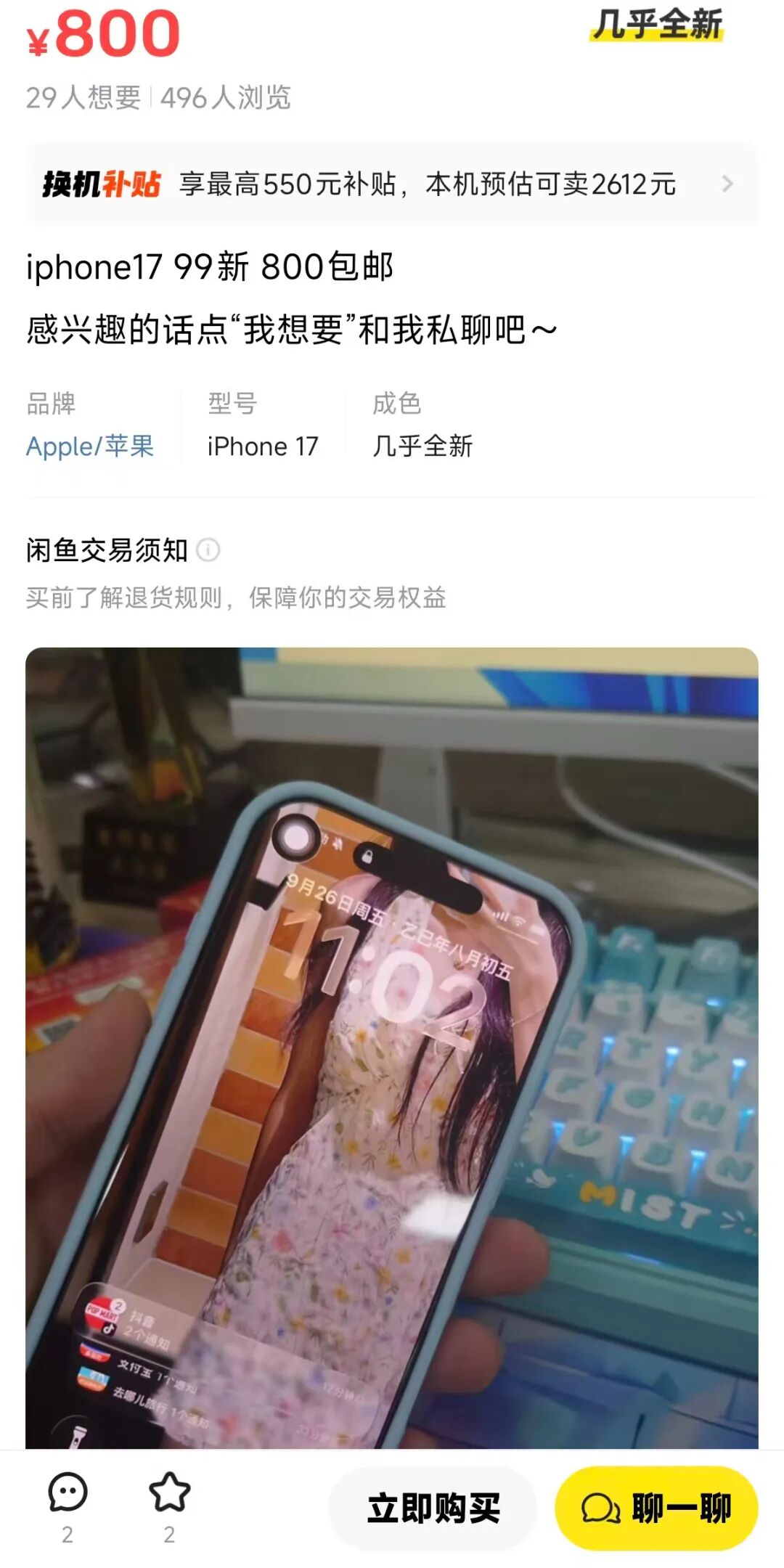 第一种坑就是纯纯的骗术,骗子以极低价格诱导你先款,这在闲鱼司空见惯。比如我按价格排序搜iPhone17,找到99新800元包邮的帖子,居然还有29人想要(跟骗子聊过)。之所以骗子设置800元,是因为就算报案,也没达到立案标准。