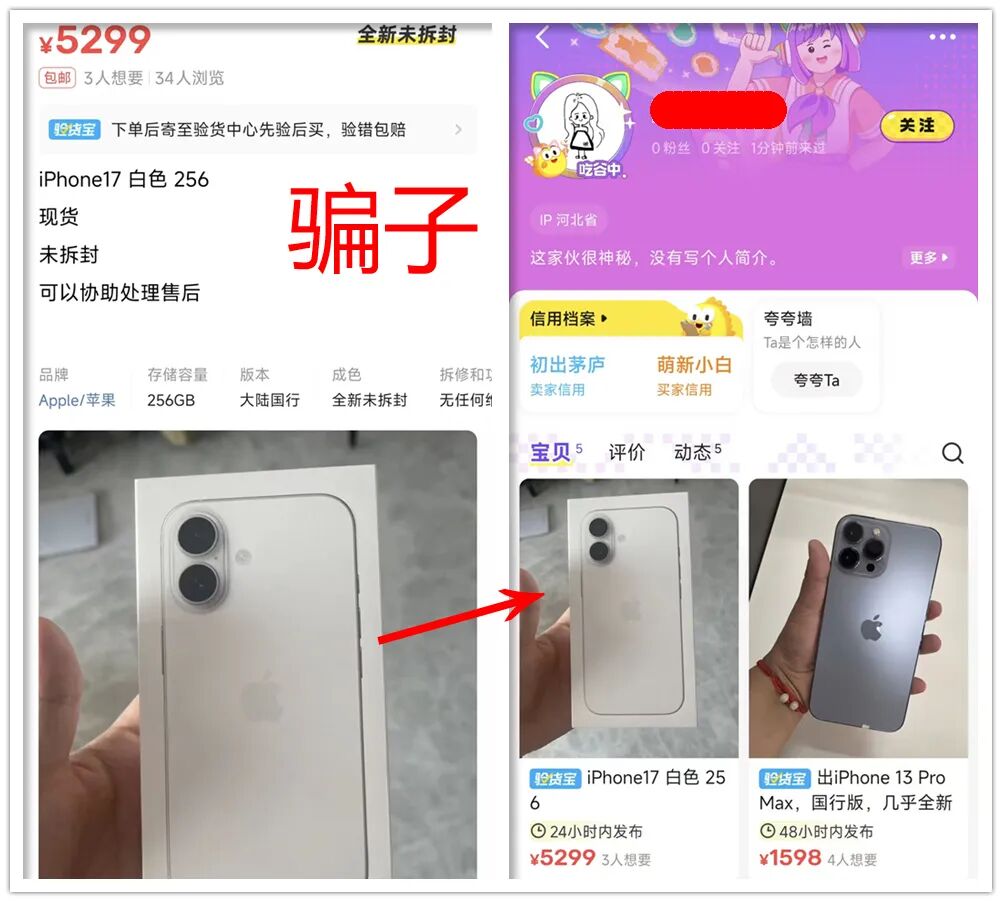 第二种坑不要求你先款,而是低价引流到线下。比如这台iPhone17(256G)未拆封标价5299元,还支持验货宝,就连老手也会愣一下,毕竟价格不算太离谱。