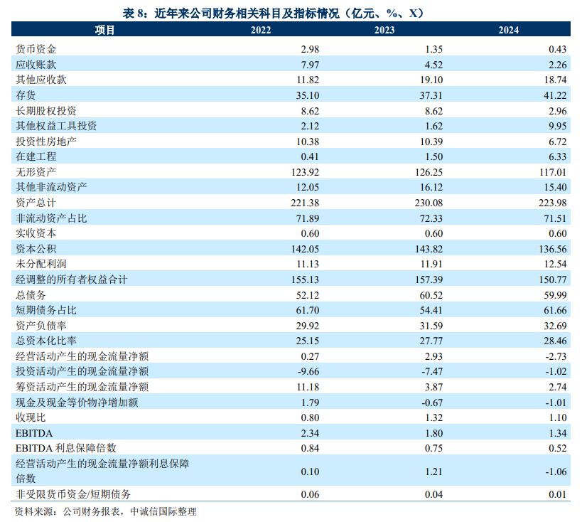 2024年期末,登封建投其他应收款中应收登电集团和河南中岳非晶新型材料股份有限公司利息分别为3205.67万元和292.31万元,根据登封建投2024年度审计报告,上述利息均已逾期。经公开查询,登电集团、中岳非晶均涉及多起被执行案件,均被纳入失信被执行人、限制高消费名单,且中岳非晶涉及破产案件。整体来看,登封建投部分资金拆借对象存在信用不良,且部分应收利息已逾期,需对相关主体经营情况以及后续款项回收情况保持关注。受限情况方面,截至2024年末,登封建投受限资产规模22.39亿元,主要为用于抵质押借款的存货及其他权益工具投资等。截至2024年末,登封建投公司账面货币资金规模继续下降至0.43亿元,其中0.12亿元受限,货币资金保有量不足。