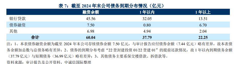 38亿短期债务压顶,债务期限结构亟待优化2024年登封建投总债务为59.99亿元,主要由银行借款和债券构成,主要合作银行包括郑州银行、中原银行等,但根据公司披露的 2024 年年度审计报告,公司存在已到期未偿还的长期借款,2024年末余额为1.65亿元,过往债务履约情况差;同时,登封建投整体融资成本相对较高;期限结构方面,公司短期债务占比大幅提高,2024年末达到61.66%,短期债务偿付压力大,债务期限结构亟待优化。截止2024年末公司债务到期合计60.04亿元,由银行贷款、债券融资和其它债务构成,一年以内到期债务总额为37.79亿元。