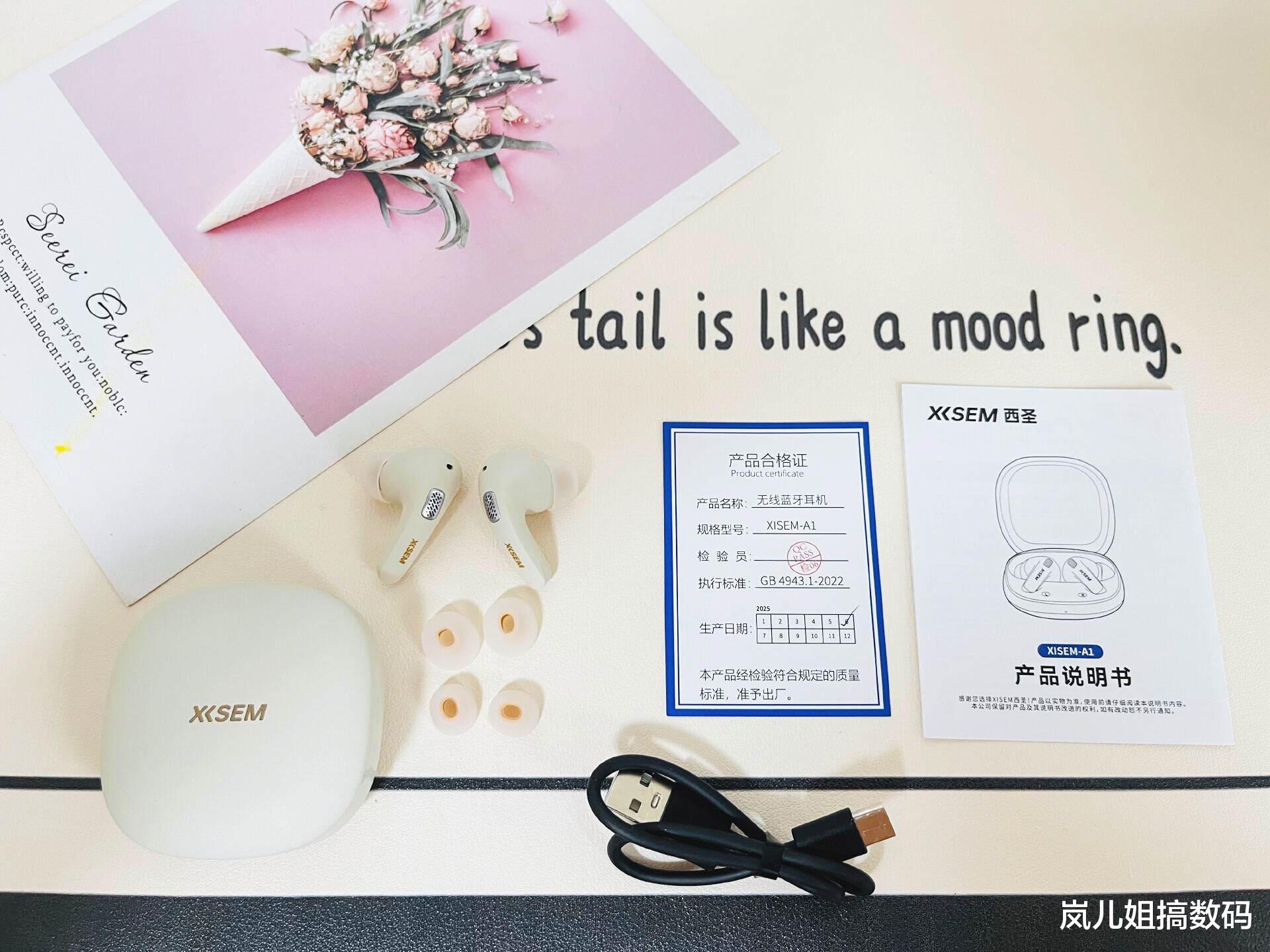 包装盒内包含了西圣A1入耳降噪蓝牙耳机、耳机充电仓、Type-C 充电线、3套硅胶耳帽、说明书、质检卡。