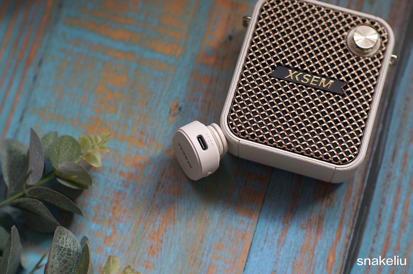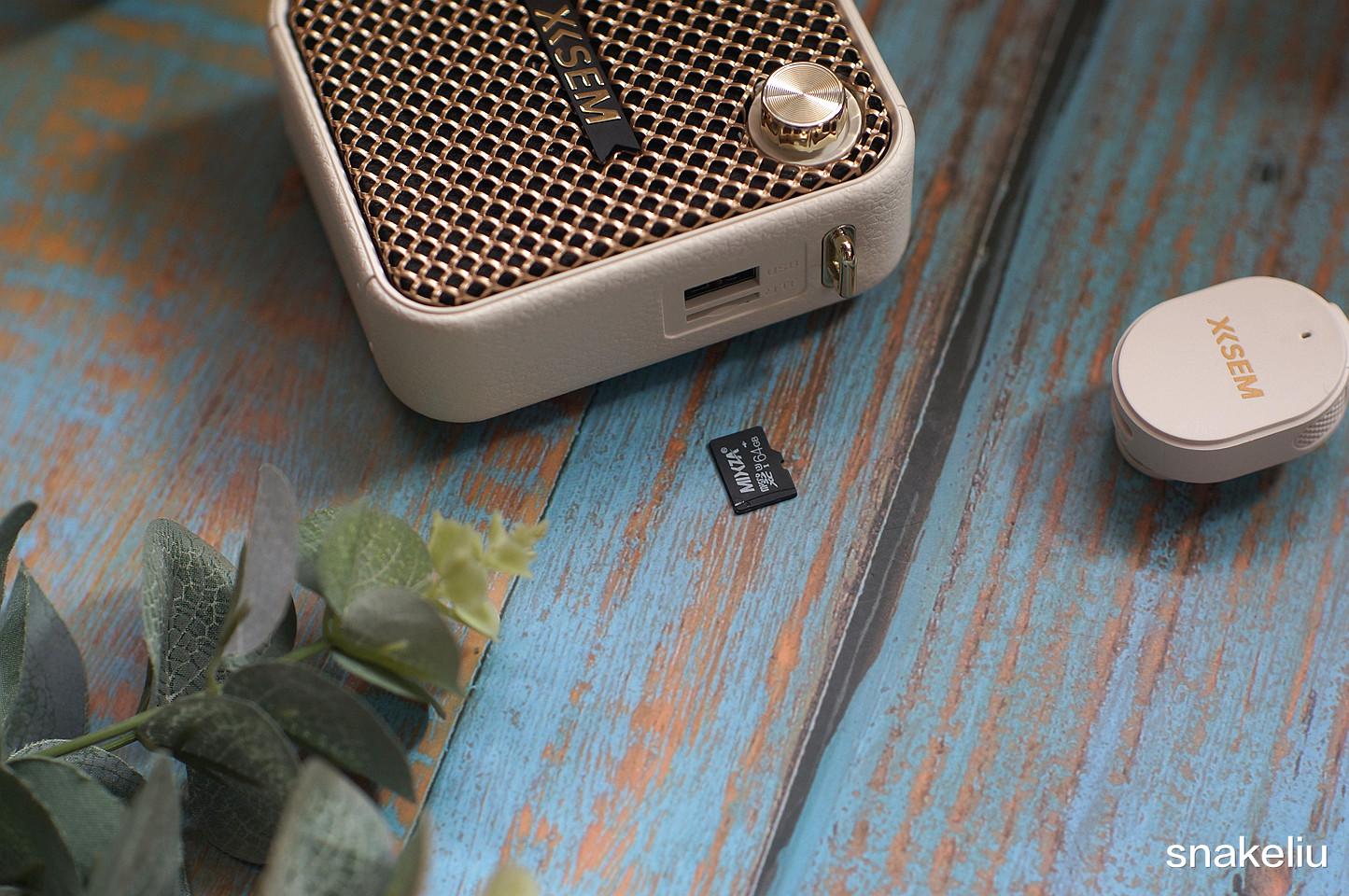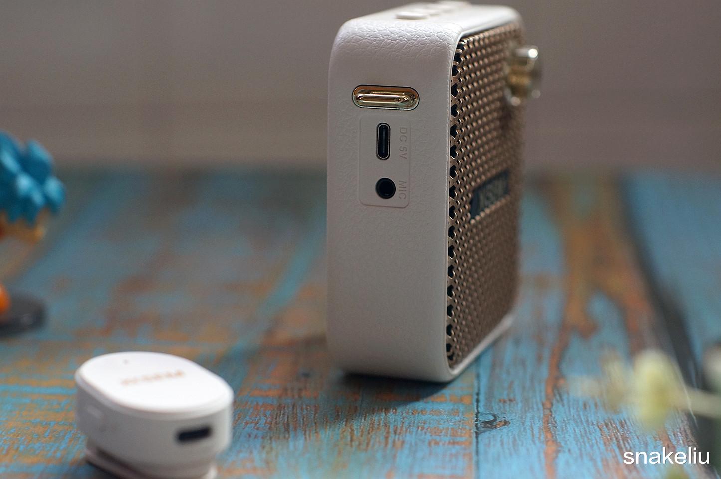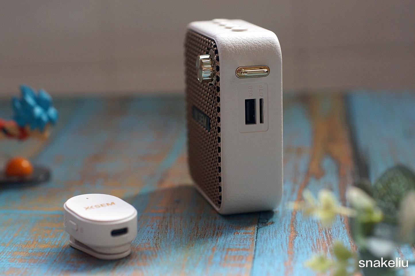 西圣BEE的外观设计更加类似智能蓝牙音箱,整个侧面有类似皮质的纹理处理。两个侧面有比较多的接口,分别有挂绳扣、USB口、TF卡槽、Type-C充电口和3.5mm麦克风口。内置电池和蓝牙芯片,可以有线或者无线连接麦克风。TF卡和USB口也有一定的扩展性能。