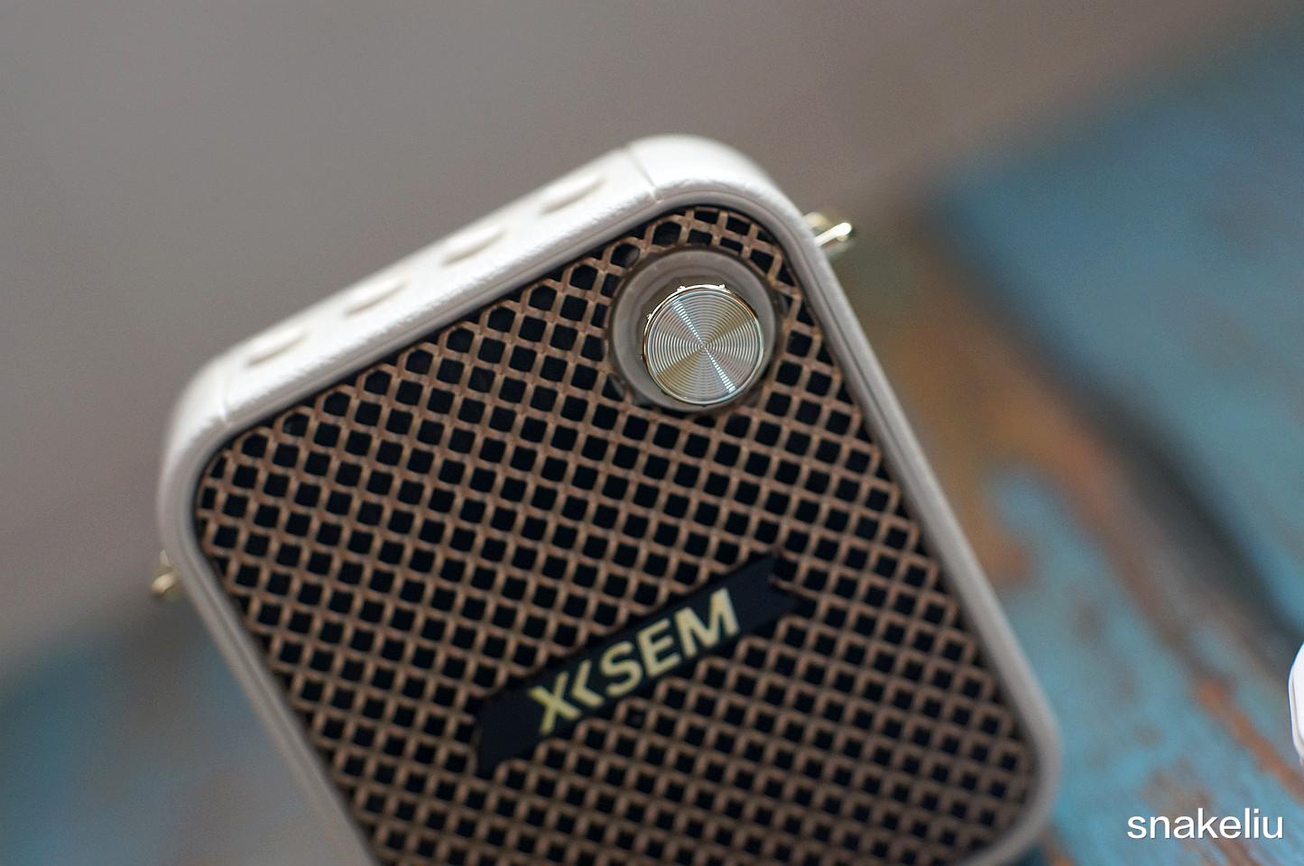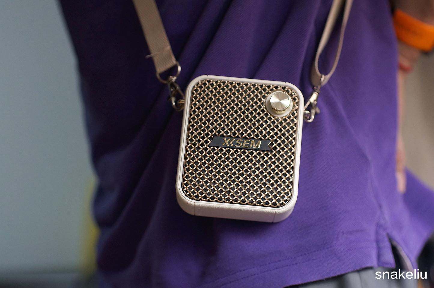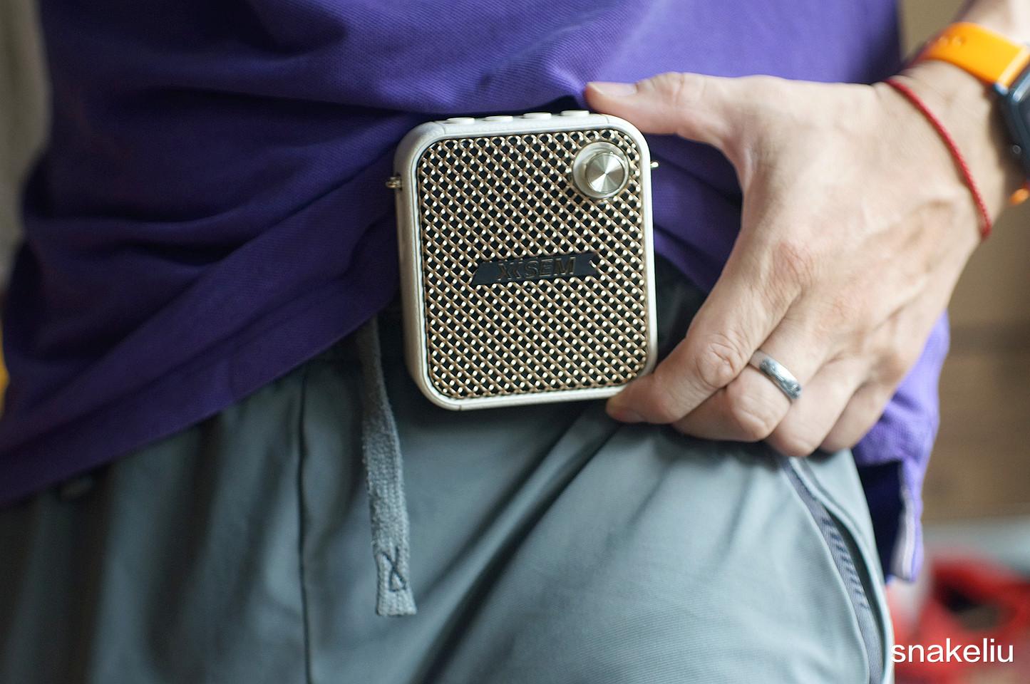 可以把西圣BEE轻松挂在腰间,如果皮带有些厚,也可以用自带的背带,把西圣BEE给背在肩上变成一个时尚的小背包,其正面是扬声器的出音面,右上角还有一个旋钮按键,不仅是主机的开关键也是可以用来旋转调整扬声器音量的。