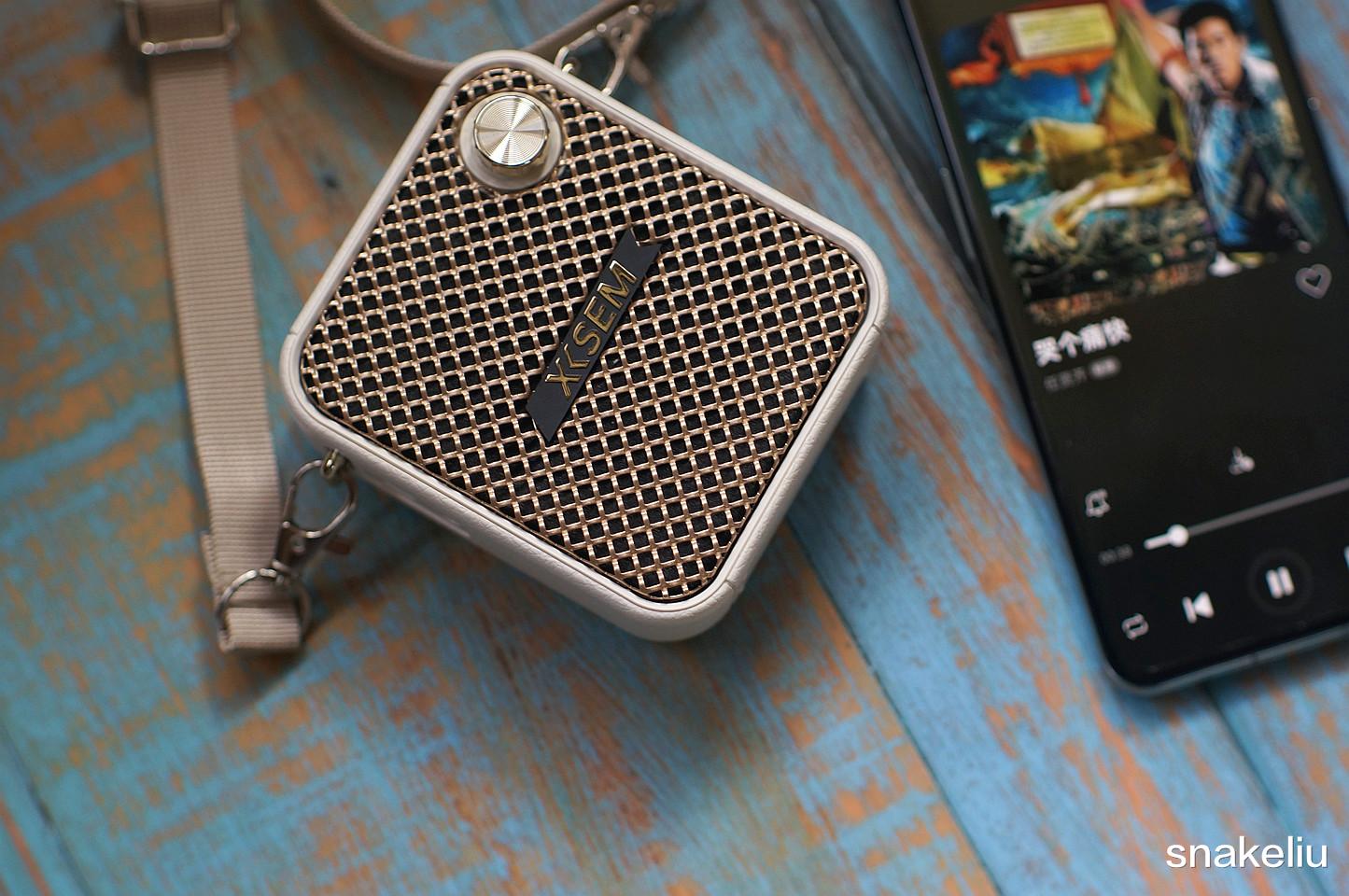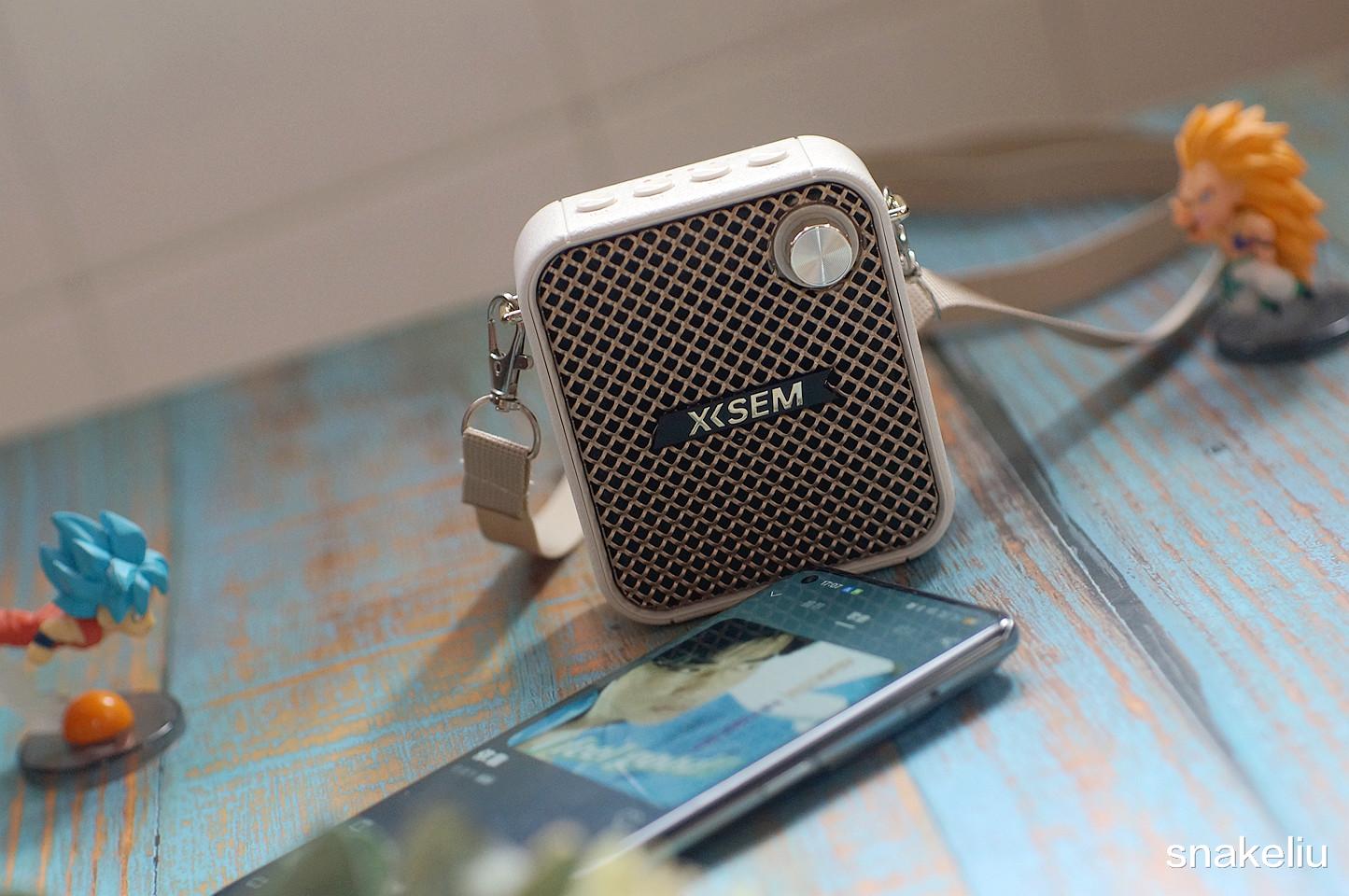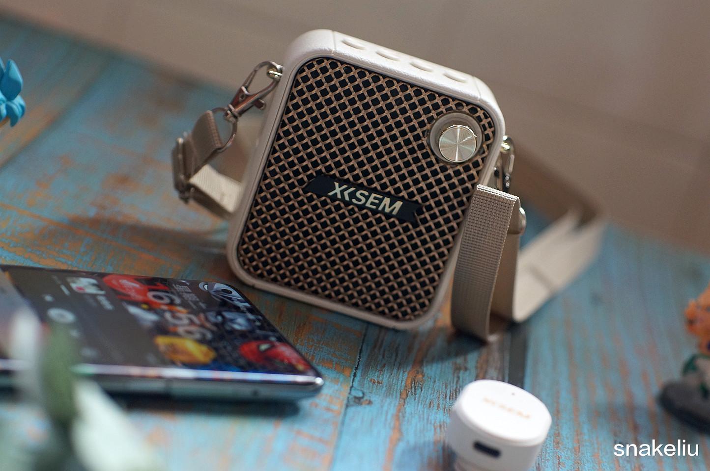 可以把西圣BEE轻松挂在腰间,如果皮带有些厚,也可以用自带的背带,把西圣BEE给背在肩上变成一个时尚的小背包,其正面是扬声器的出音面,右上角还有一个旋钮按键,不仅是主机的开关键也是可以用来旋转调整扬声器音量的。